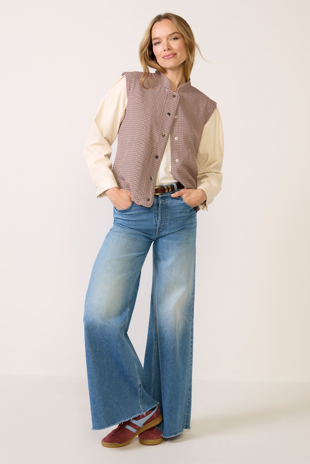 Add a sport bomber to your jacket collection with the Effie Bomber by Melissa Nepton, featuring snap button closures, contrasting sleeves, and a versatile houndstooth print.