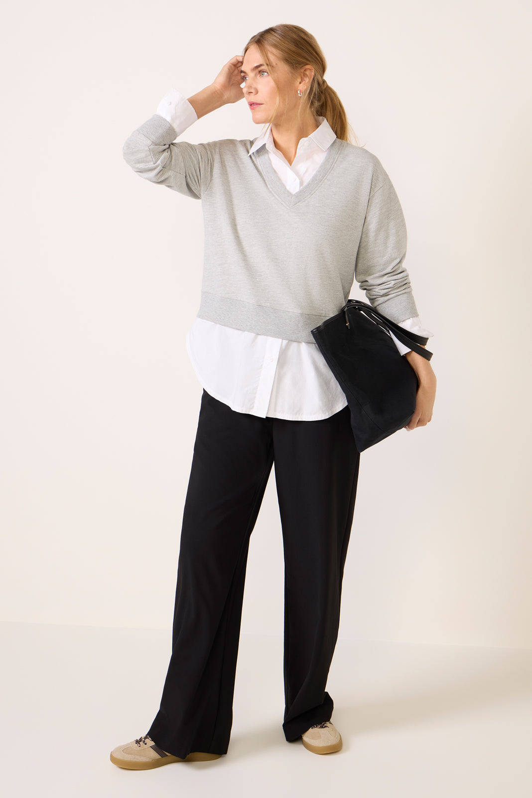 The Ellie Twofer Sweatshirt byZ Supply makes layering easy, featuring a cotton poplin button down and a soft knit sweater vest with a v-neckline, long sleeves, and a relaxed fit.