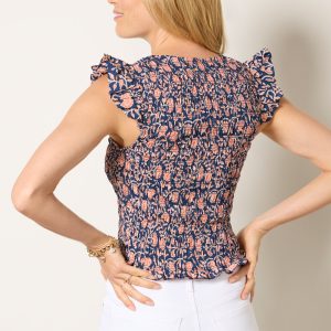 Finished with flutter sleeves and a fitted smocked body, the Eloise floral top by EVEREVE is the perfect pick for summer, featuring cropped fit, ruffled hemline, and cotton fabric.
