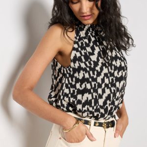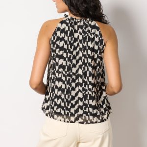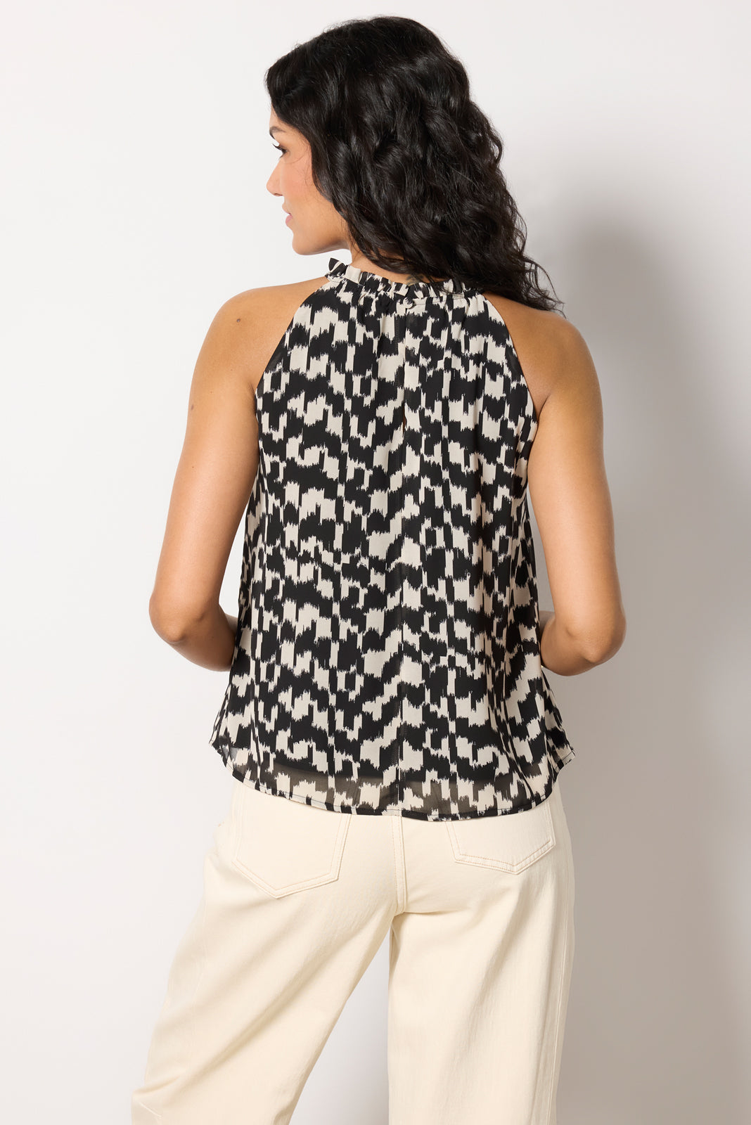 Give your wardrobe a chic pop of print with the Etta Halter Tank by EVEREVE, crafted in flowy chiffon fabric with a ruffled collar and back button closure.