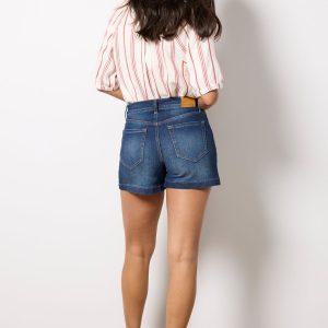 Angled front pockets and vertical seam details elevate these versatile jean shorts by EVEREVE, crafted in soft stretch denim with a mid-rise fit and faded dark blue wash.