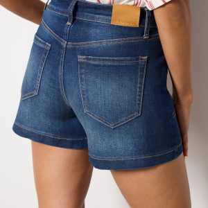 Angled front pockets and vertical seam details elevate these versatile jean shorts by EVEREVE, crafted in soft stretch denim with a mid-rise fit and faded dark blue wash.
