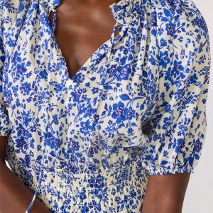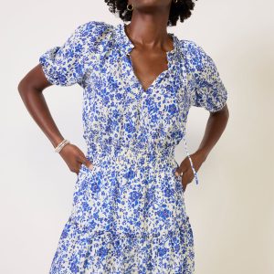 Fun and airy, this easy dress by Rails features a lightweight chiffon fabric withsubtle peplum sleeves, a v-neckline, and a shirred waist that flows into a lined, tiered skirt.
