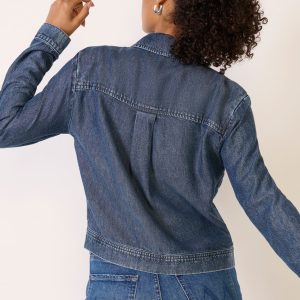 Crafted in a woven chambray, this easy shacket by Cloth & Stone features oversized chest pockets, a front zipper closure, and a slightly cropped silhouette.