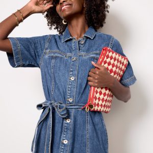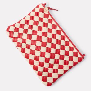 Carry your essentials in style with this gorgeous woven clutch by Clare V., crafted in puffy two-tone leather with a top zipper closure and chambray lining. The leather tabs let you attach your favorite strap to wear as a shoulder bag or crossbody.