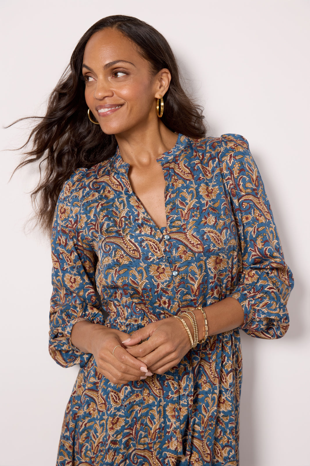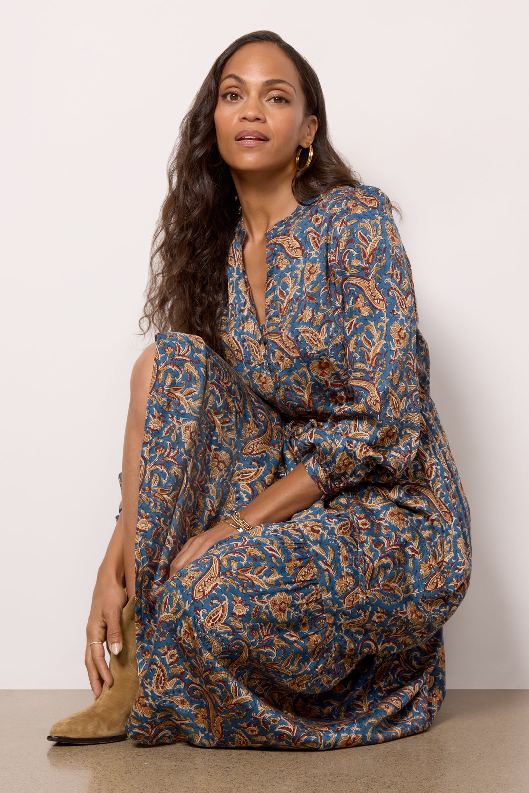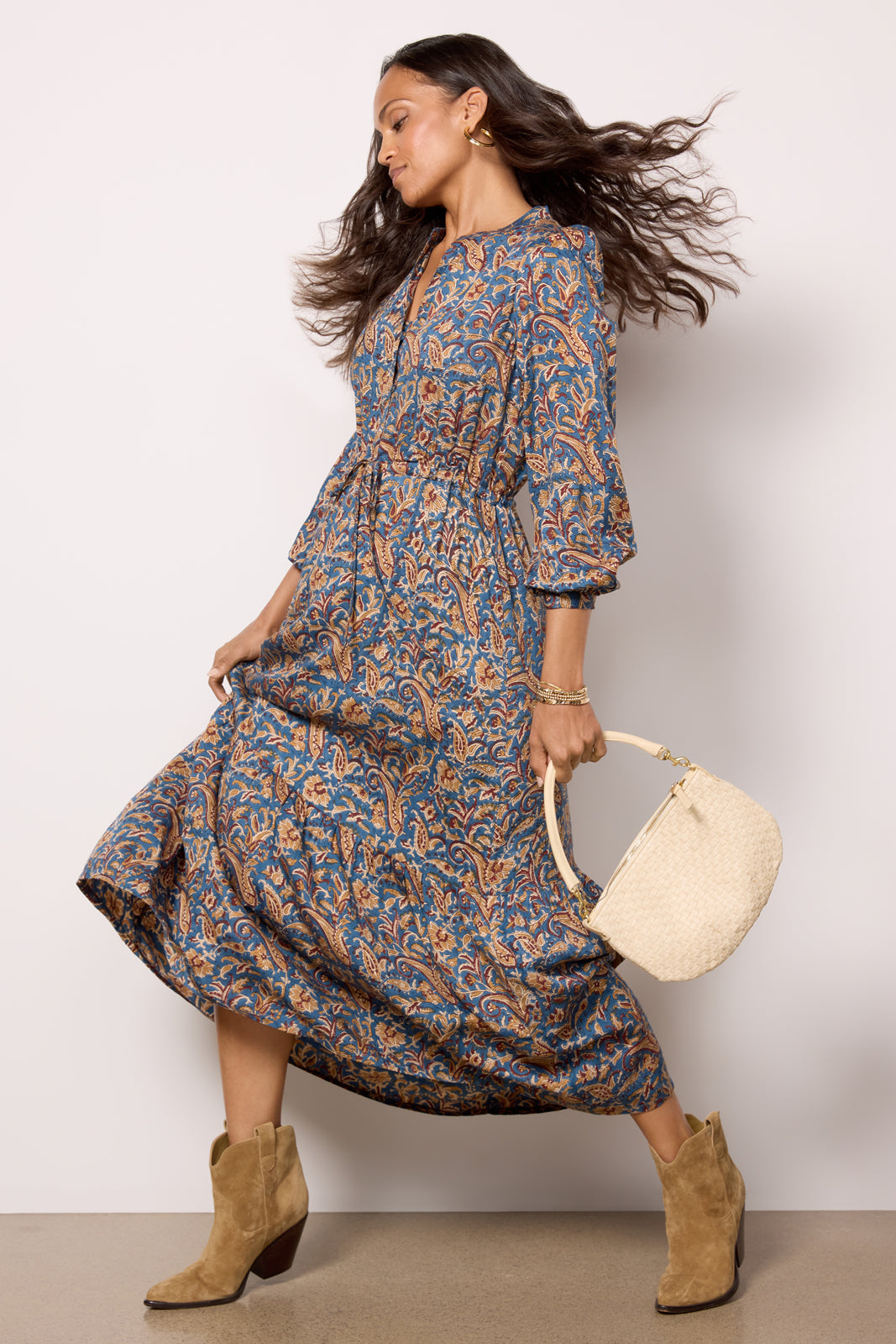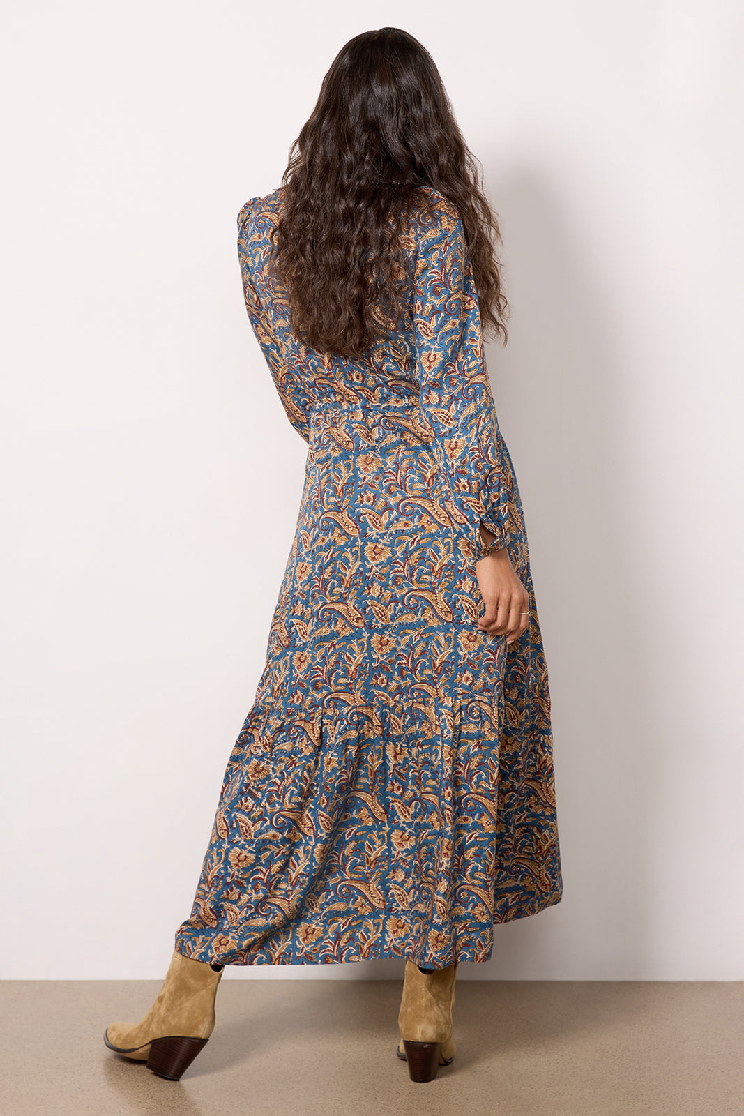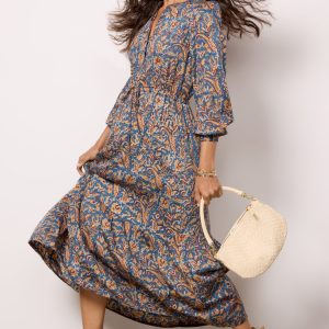 Gorgeous hand-block printed florals take center stage on this dreamy Emerson Fry dress. The Frances maxi dress features an adjustable tie waist, flowy tiered hem, and a mandarin-style collar with buttons at the chest. Pair with heels, mules, or booties for an effortlessly stylish look.