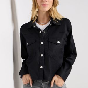 The Frankie Shacket by EVEREVE is the perfect layer for spring, crafted in a lightweight linen blend, this shirt jacket features gold snap button closures, two chest patch pockets, and a relaxed boxy fit.