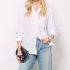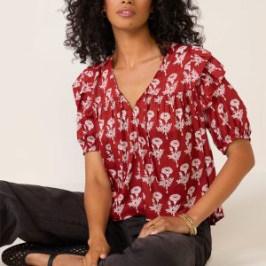 Ruffled puff sleeves elevate this fun and flowy top by Emerson Fry, featuring a relaxed fit, seamed yoke, and v-neckline with a tie detail and hook-and-eye closure.