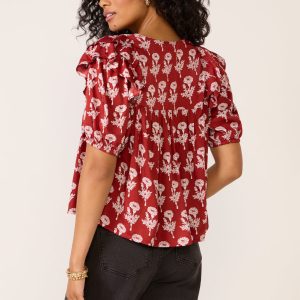 Ruffled puff sleeves elevate this fun and flowy top by Emerson Fry, featuring a relaxed fit, seamed yoke, and v-neckline with a tie detail and hook-and-eye closure.