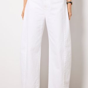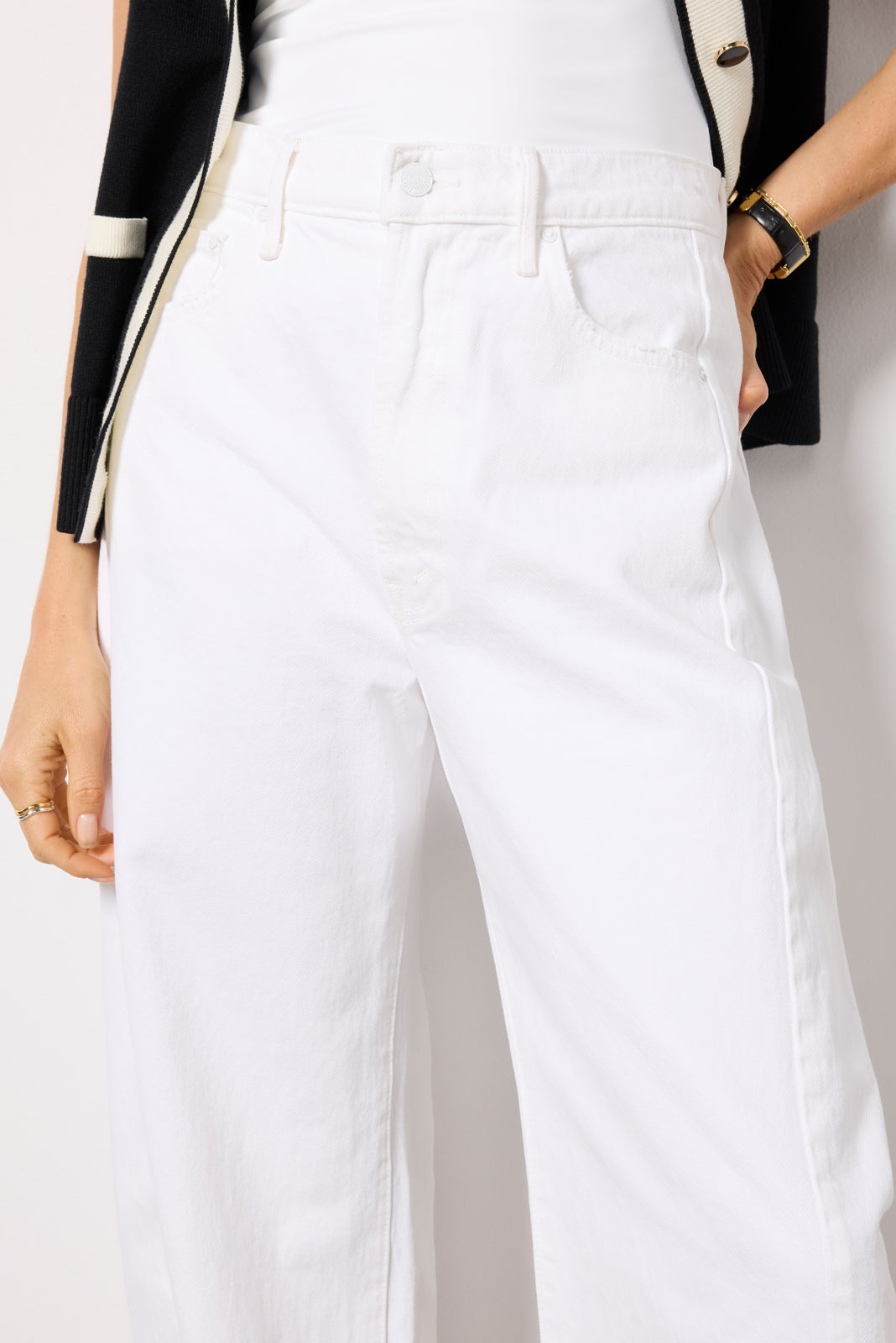 Finished in a bright white wash, the Full Pipe Ankle barrel jean by MOTHER is crafted in rigid, non-stretch cotton denim and features a high-rise fit, curved wide leg, and clean ankle-length hems.