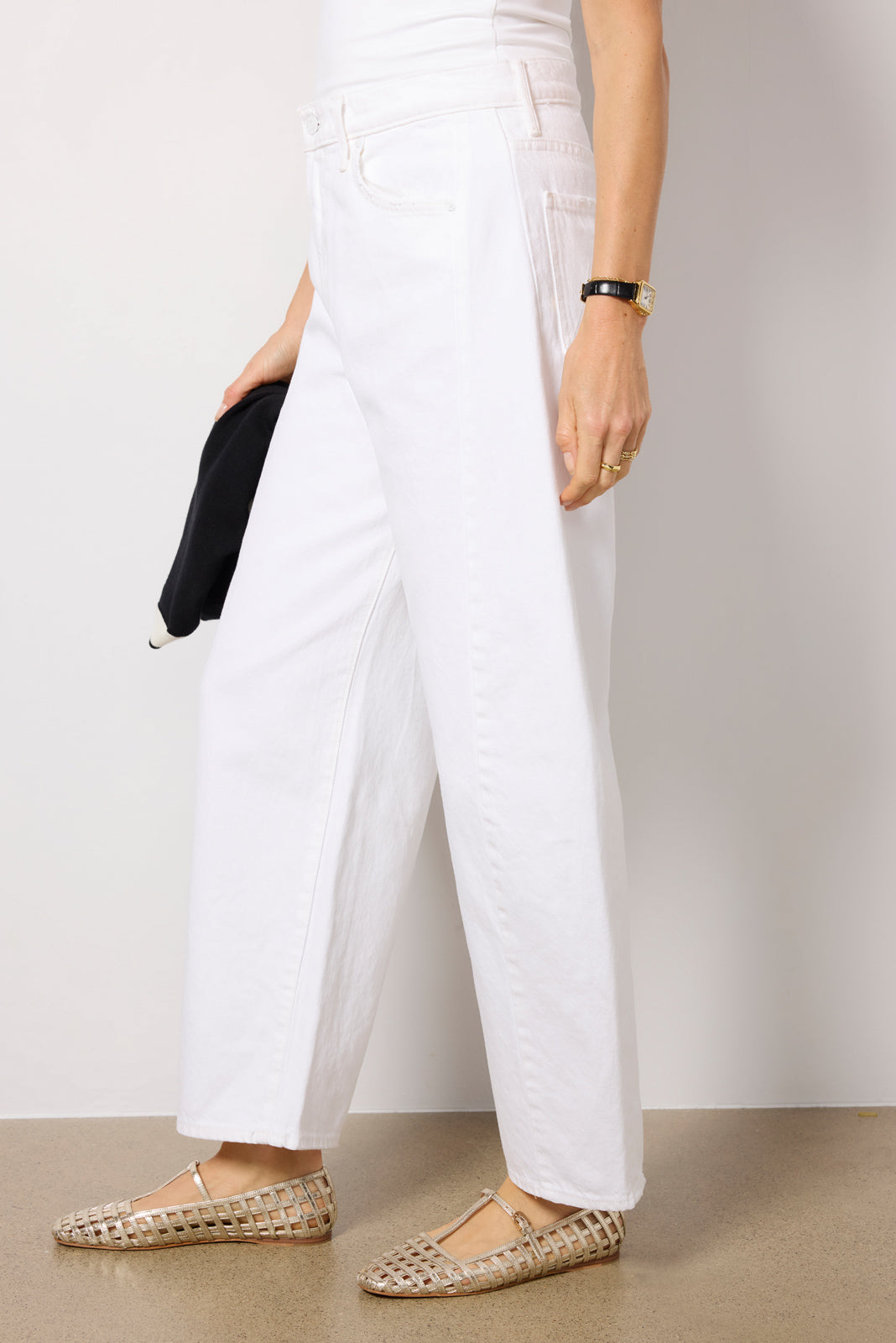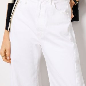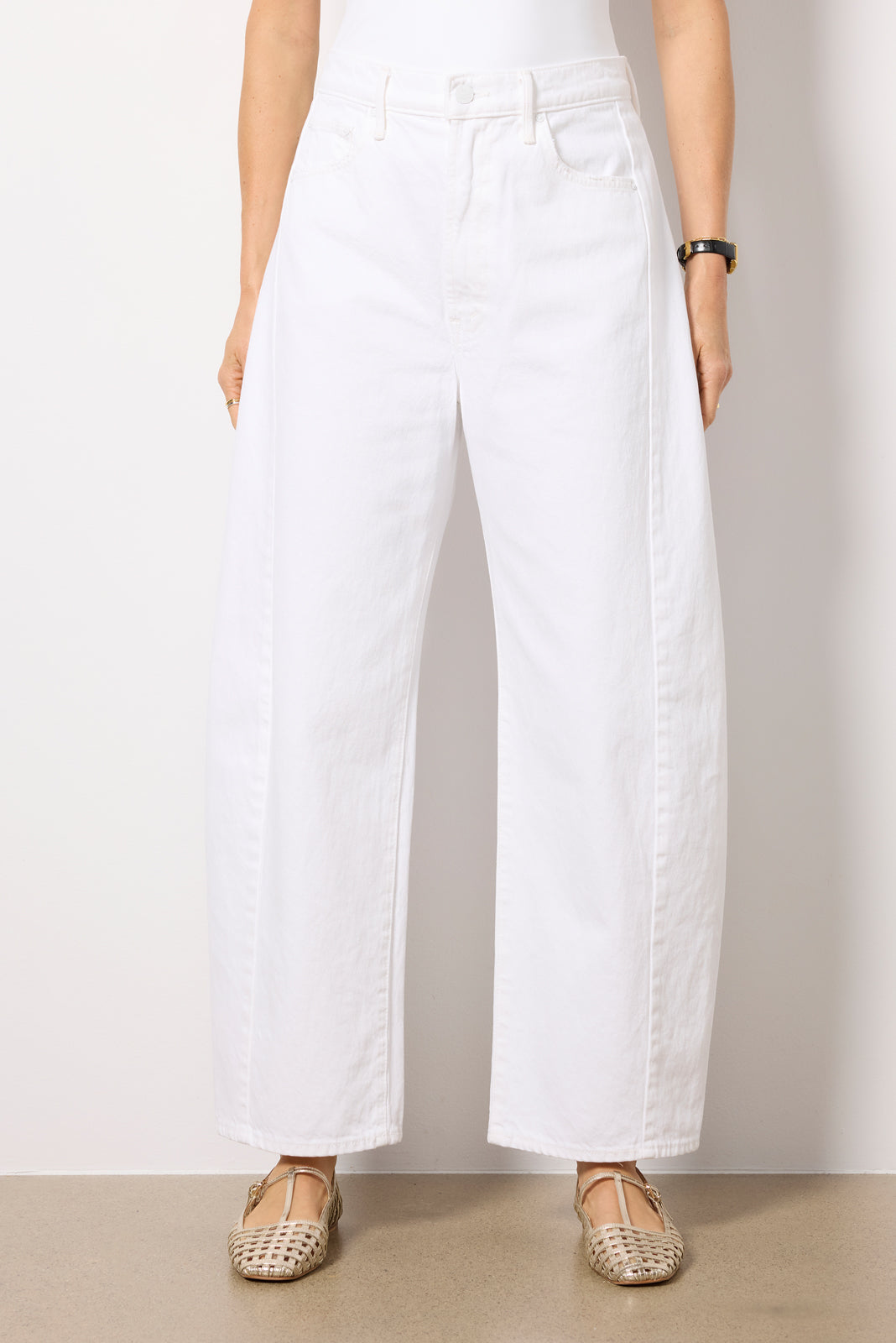 Finished in a bright white wash, the Full Pipe Ankle barrel jean by MOTHER is crafted in rigid, non-stretch cotton denim and features a high-rise fit, curved wide leg, and clean ankle-length hems.