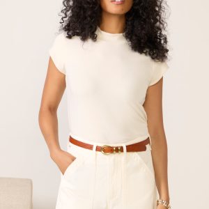 A versatile staple that can be dressed up or down, this mockneck tee by EVEREVE is crafted in soft knit fabric and features a semi-fitted silhouette with cap sleeves.