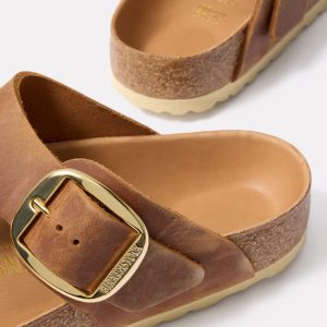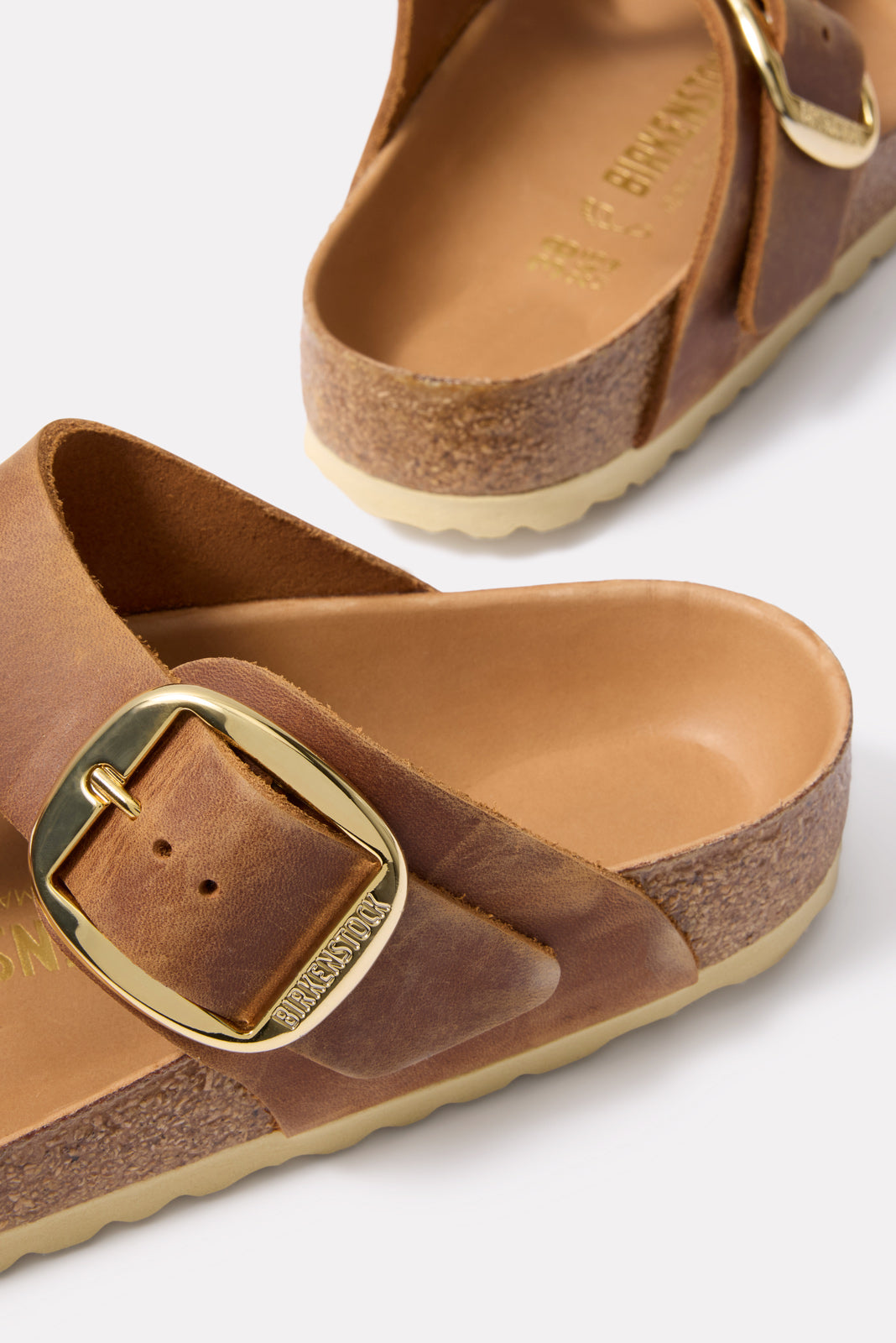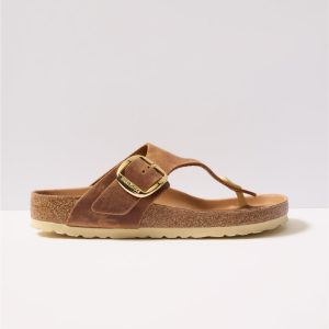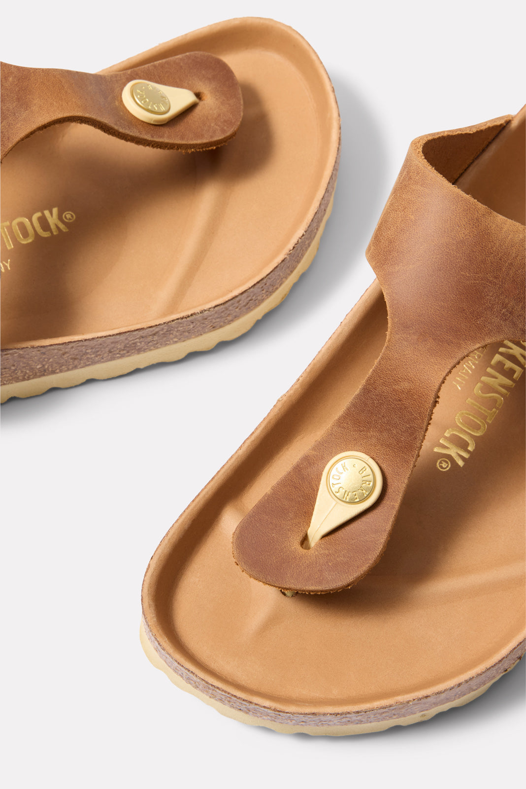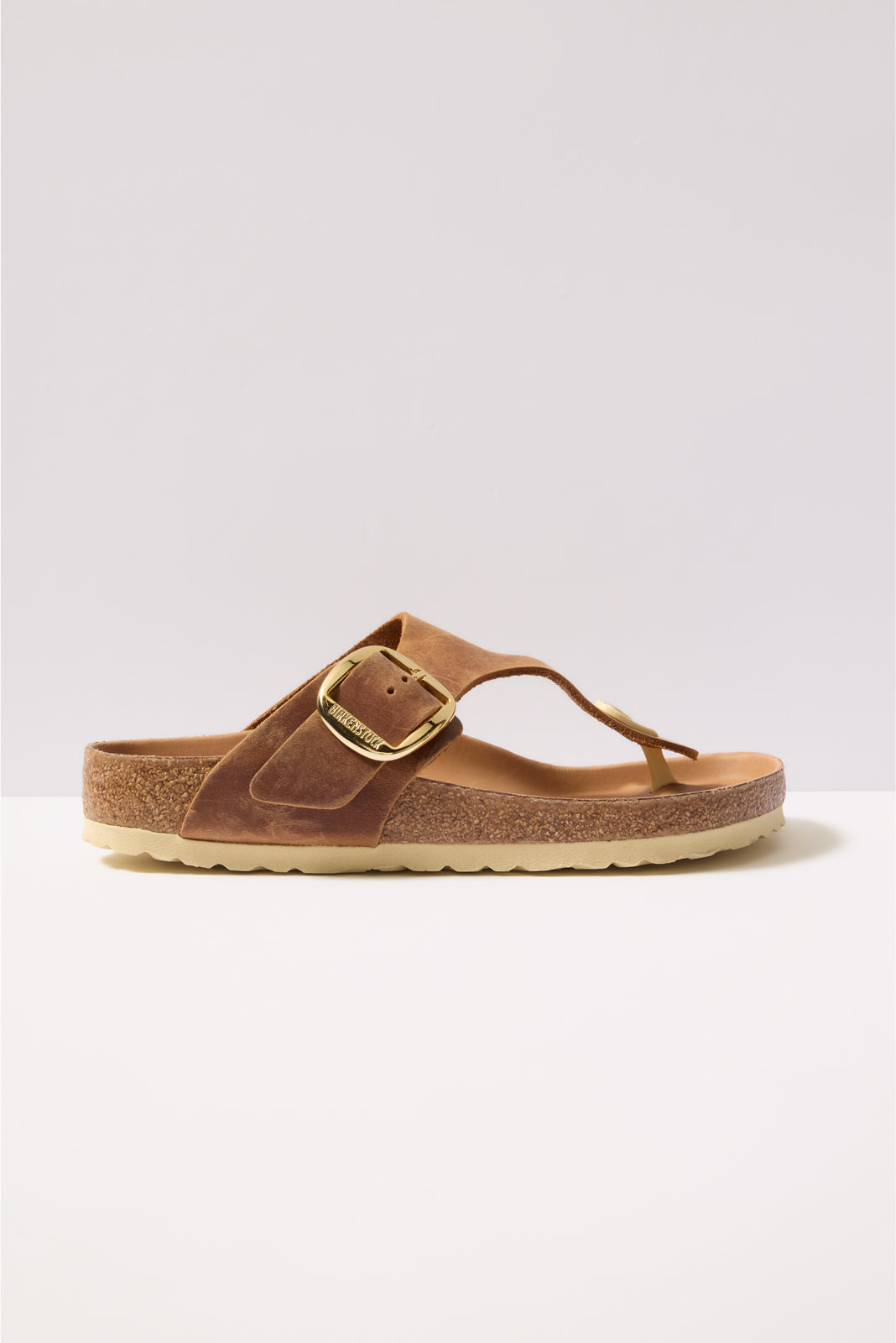 Bold gold-tone buckles elevate the classic Gizeh sandal by Birkenstock, featuring a thong-style leather strap and comfortable cork footbed.