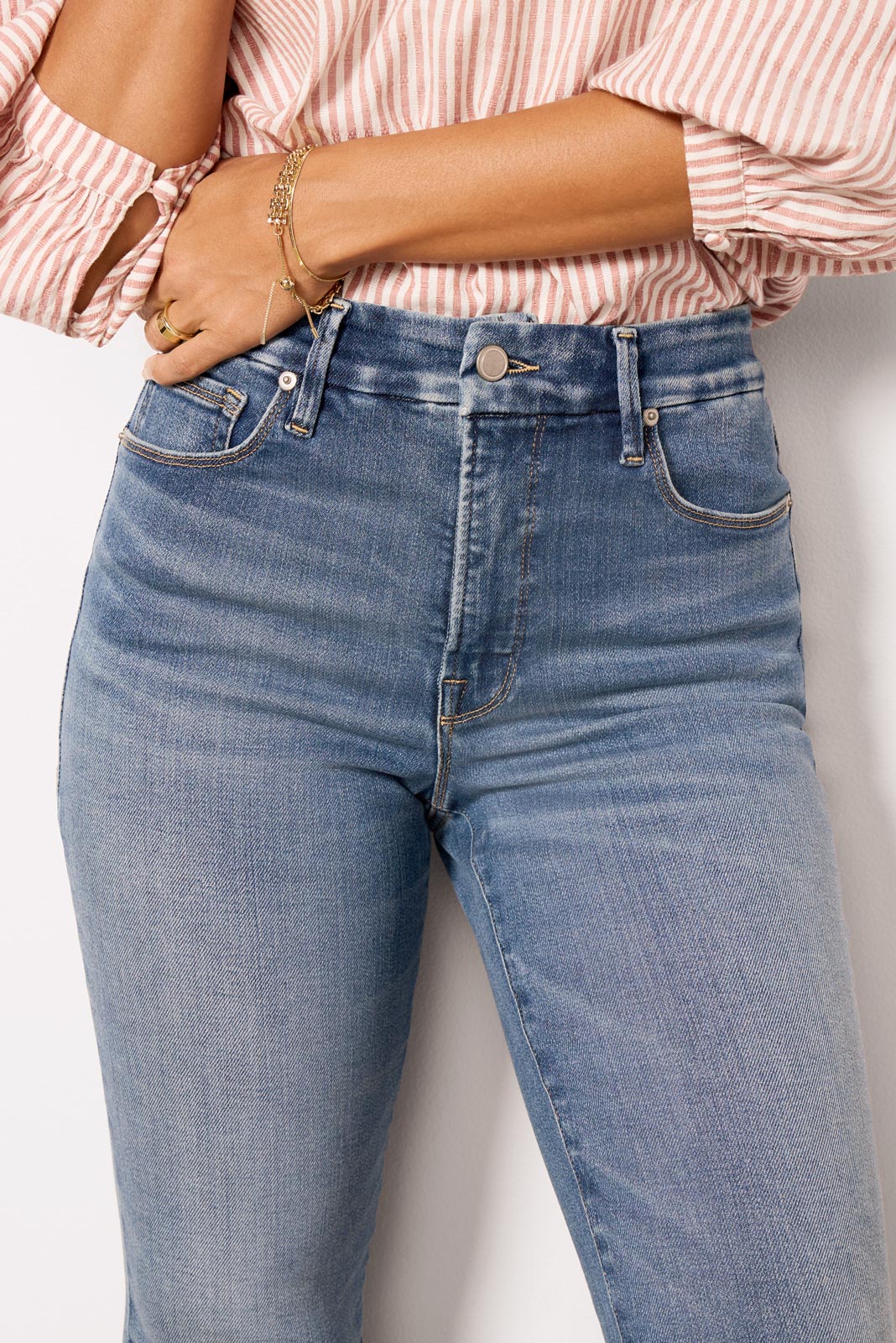 Round out your denim collection with these ultra-flattering bootcut jeans by Good American, crafted in soft stretch denim with a high-rise fit,mediumblue wash, and raw hems.
