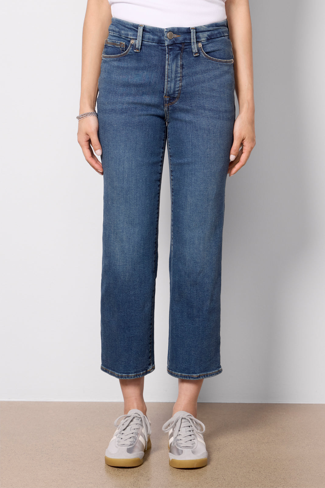 Made to fit and flatter, these Good American jeans are designed with a shorter inseam and rise for petite body types. The Good Petite Straight features a vintage-inspired straight leg, versatile blue wash, and ankle-length hems.