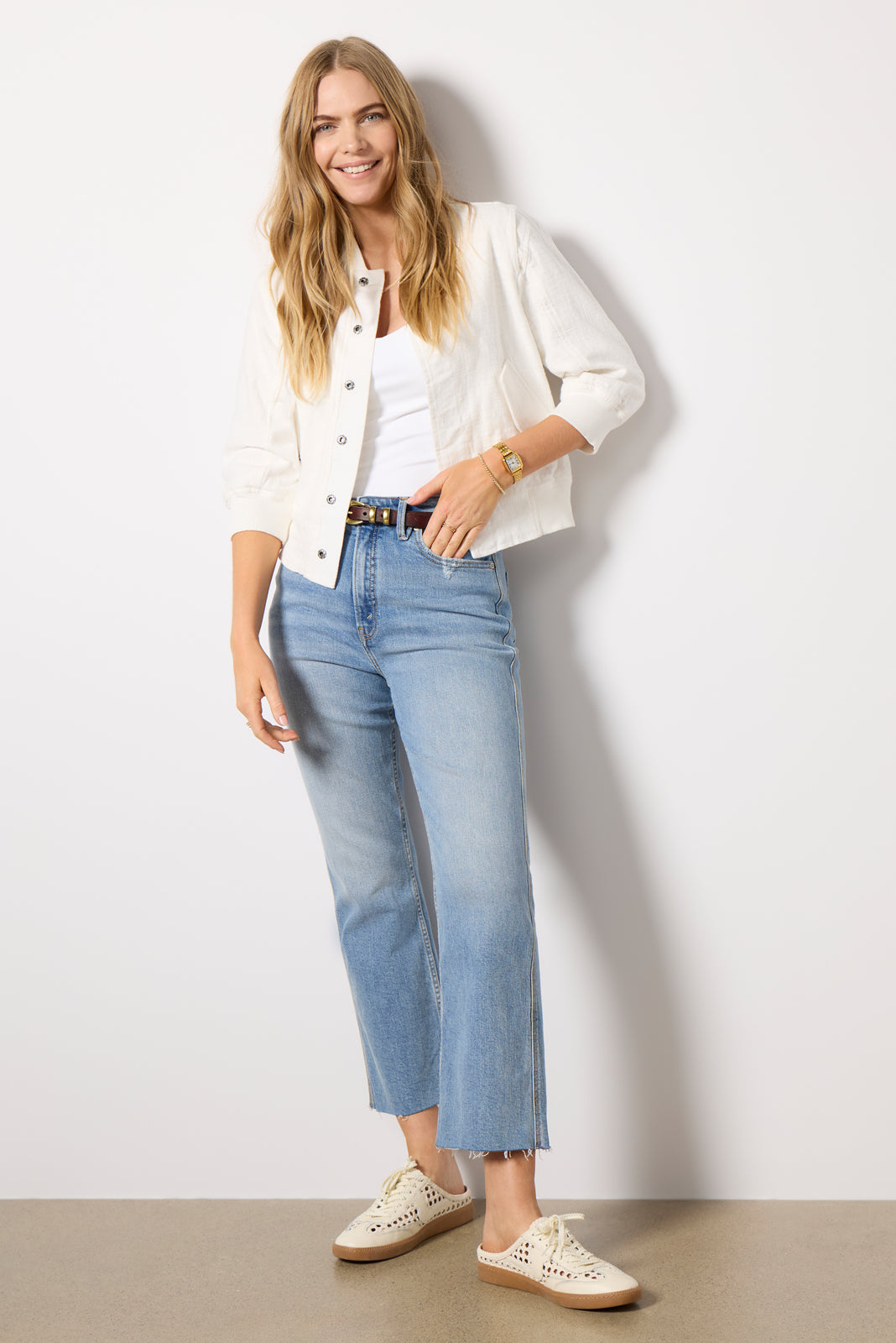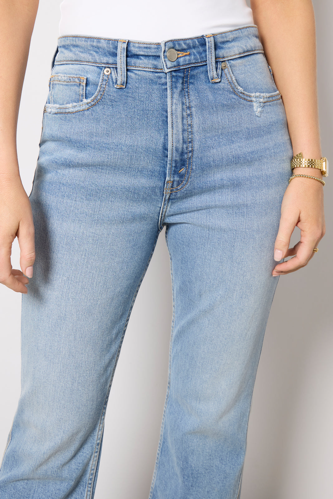 Perfect for everyday wear, thesehigh-rise kick flare jeans by Good American are crafted in soft stretch denim and feature ankle-length raw hems and aversatile blue wash with distressing around the pockets.