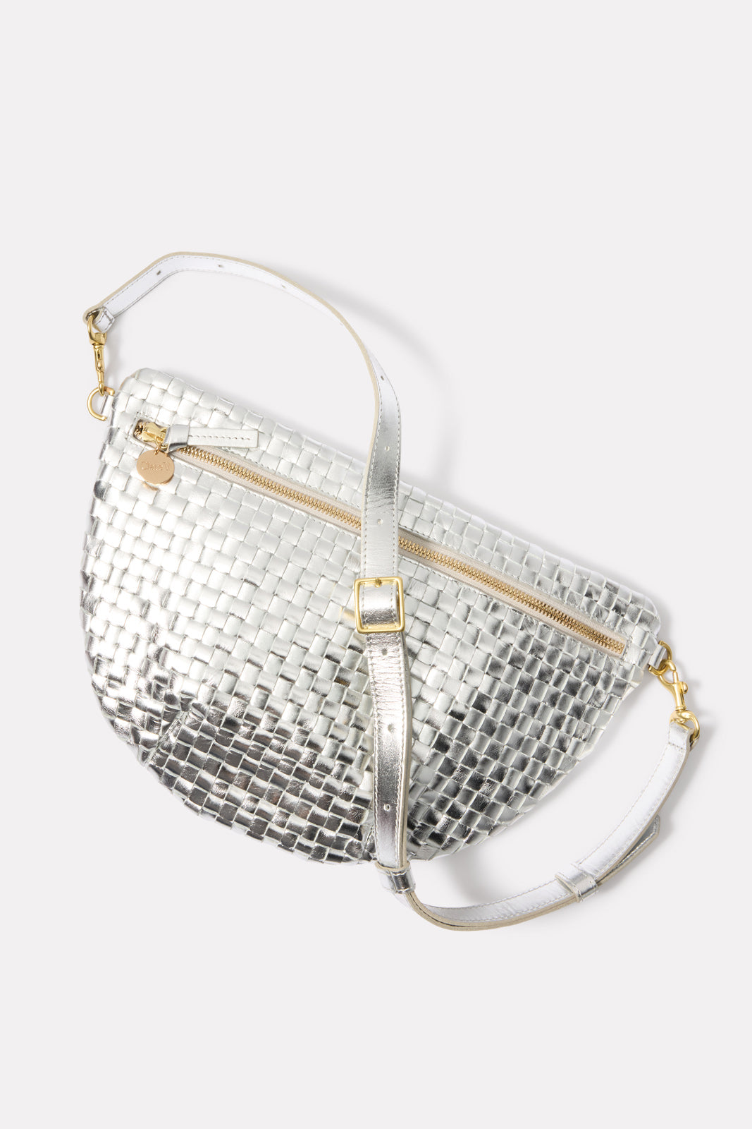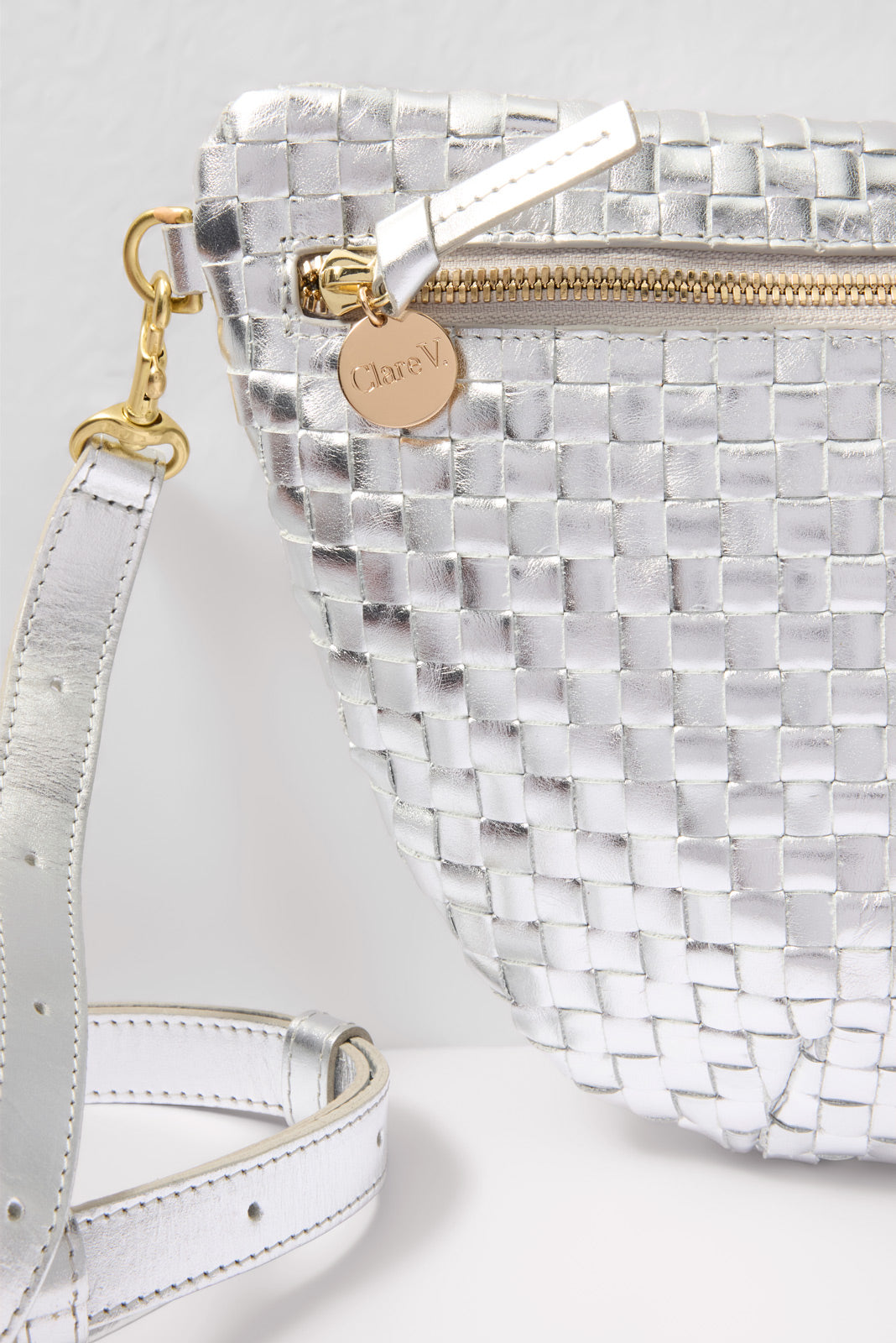 Chic and eye-catching, this metallic Clare V. bag is the perfect on-the-go essential. The Grande Fanny is crafted in wovensilver leather with a chambray-lined interior and zipper closure. The detachable, adjustable strap can be worn at the waist, across the body, or on the shoulder.