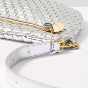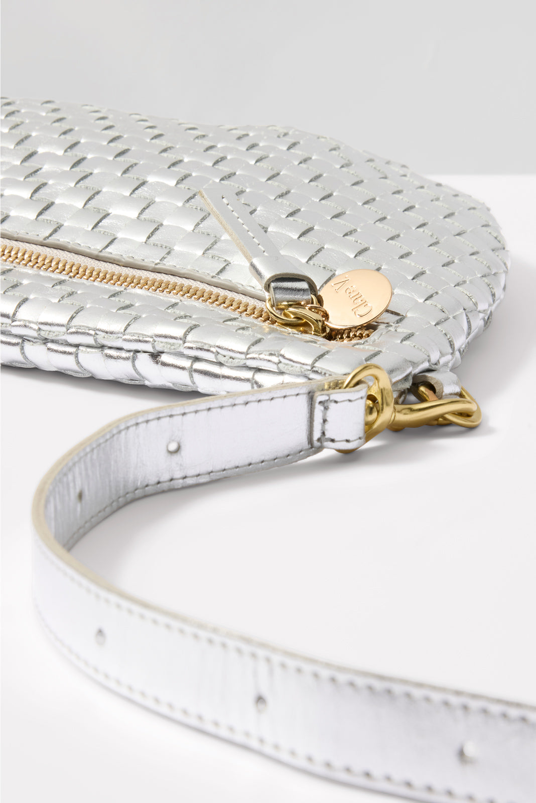 Chic and eye-catching, this metallic Clare V. bag is the perfect on-the-go essential. The Grande Fanny is crafted in wovensilver leather with a chambray-lined interior and zipper closure. The detachable, adjustable strap can be worn at the waist, across the body, or on the shoulder.