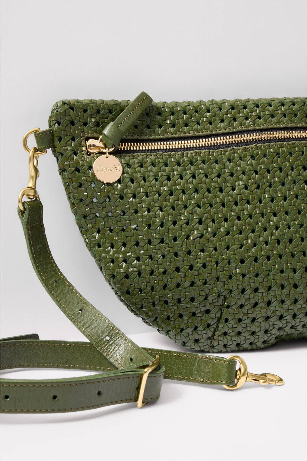 Chic and versatile, this Clare V. bag is the perfect on-the-go essential. The Grande Fanny is crafted from woven leather in a rattan pattern with an unlined interior and zipper closure. The detachable, adjustable strap can be worn at the waist, across the body, or on the shoulder.