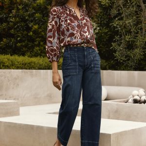 Add a pop of print to your wardrobe with theHaddon Top by Velvet. This button-front blouse is crafted in lightweight cotton cambric with a round collar, smocked front yoke, and three-quarter puff sleeves.