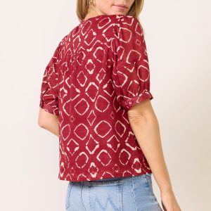 Finished in a shibori tie-dye pattern, the Hallie blouse by EVEREVE features a flowy, lined body, v-neckline, and elbow-length puff sleeves with button cuffs.