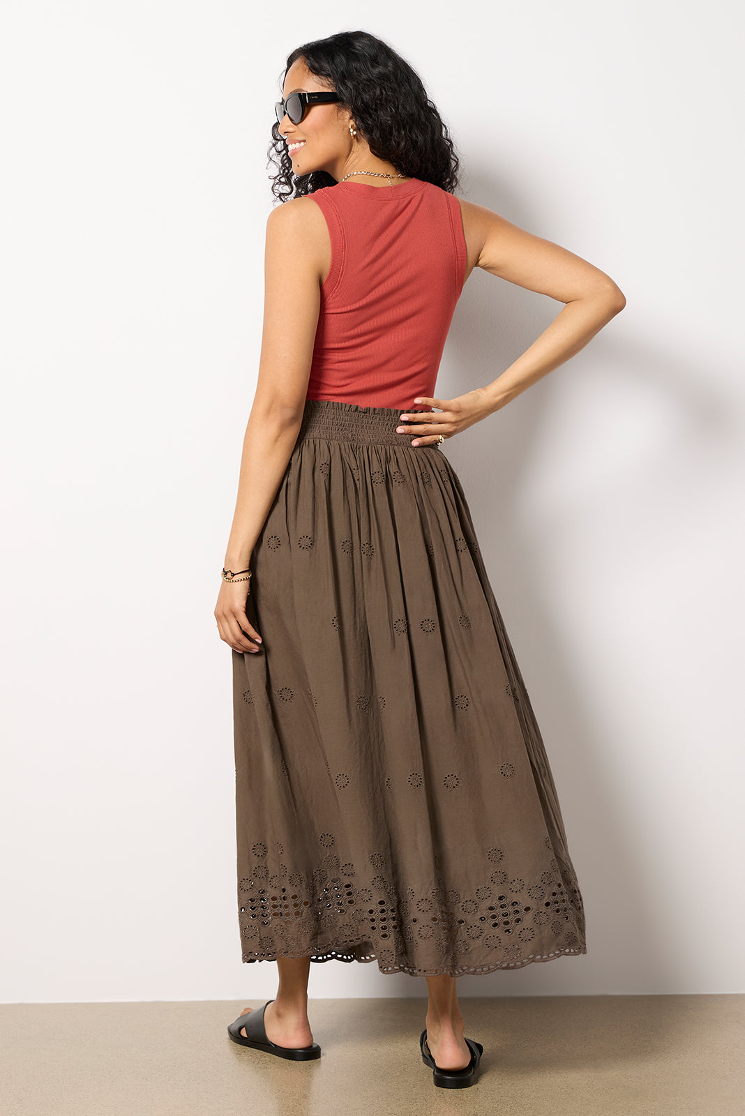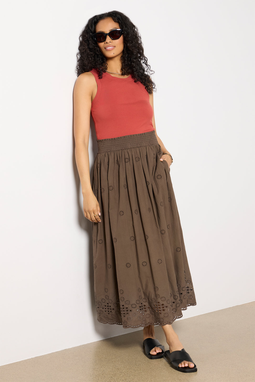 Embroidered eyelets detail this flowy cotton midi skirt by Michael Stars, finished with a scalloped hem, side pockets, and a smocked elastic waistband. Pair it with the matching Hilda Bubble Top for the perfect summer set.