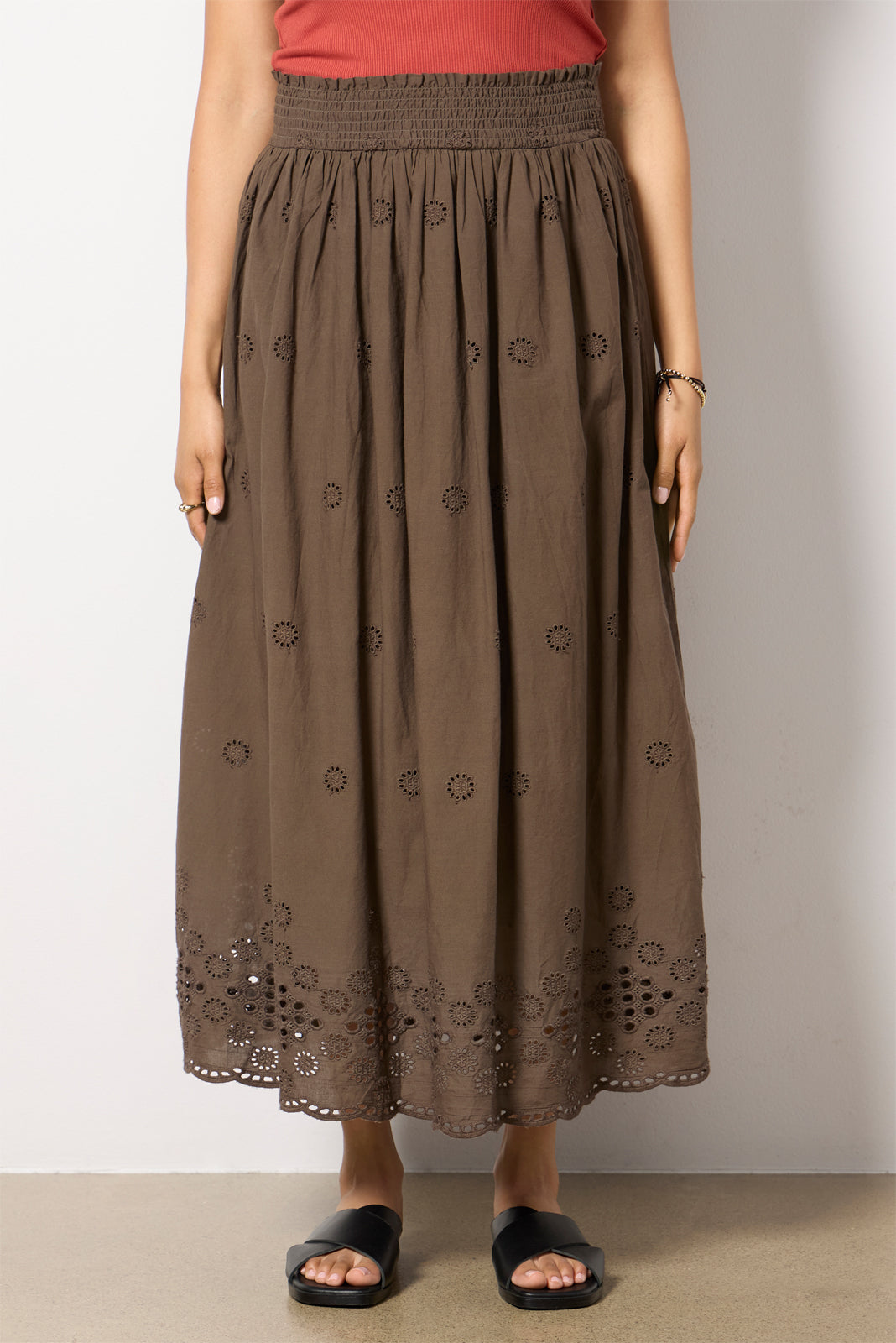 Embroidered eyelets detail this flowy cotton midi skirt by Michael Stars, finished with a scalloped hem, side pockets, and a smocked elastic waistband. Pair it with the matching Hilda Bubble Top for the perfect summer set.