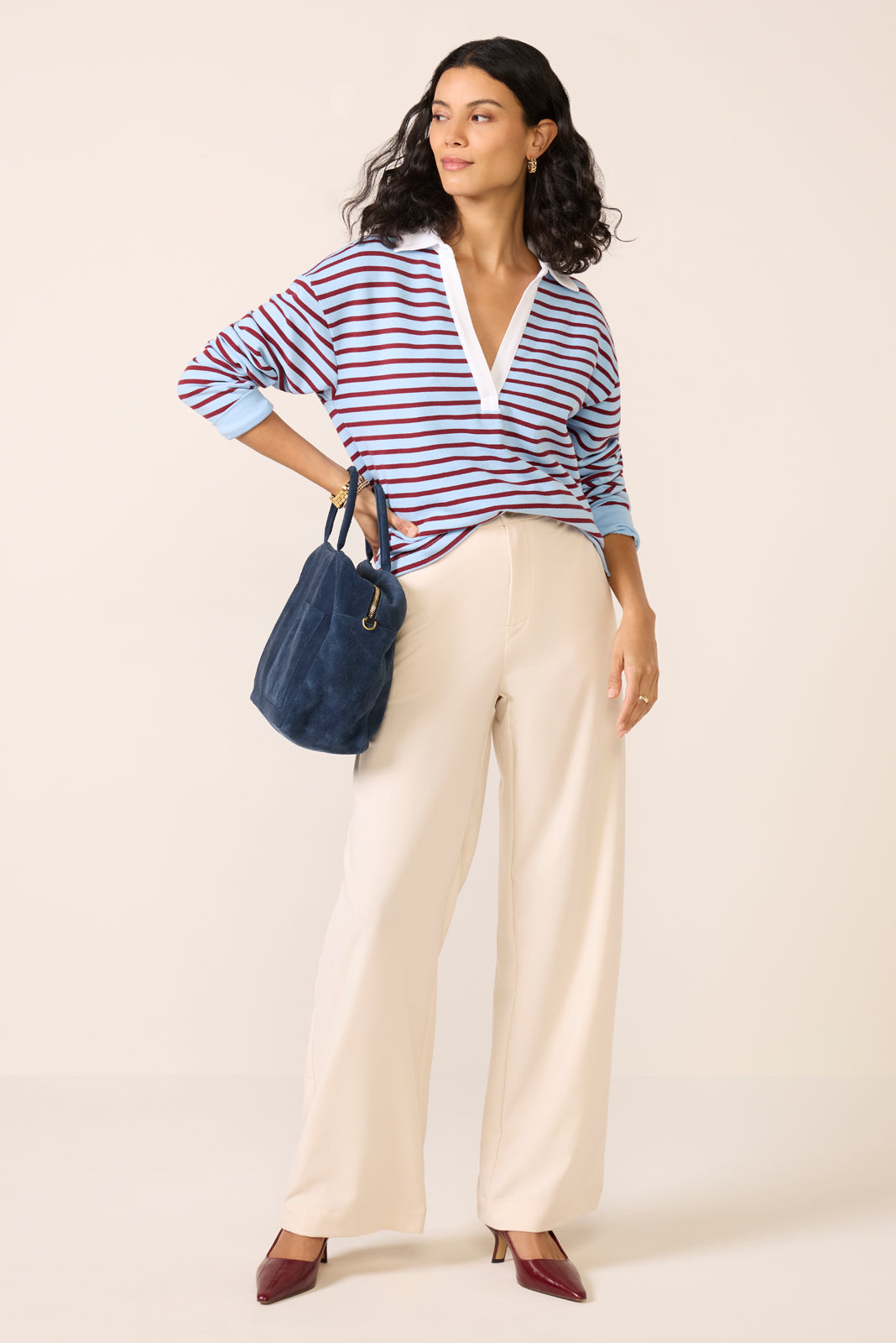 Give your wardrobe a collegiate-inspired edge with this striped rugby sweatshirt by EVEREVE. This sporty-chic pullover is crafted from comfortable cotton French terry and features a relaxed fit, long sleeves, and a deep v-neckline with a polo collar.