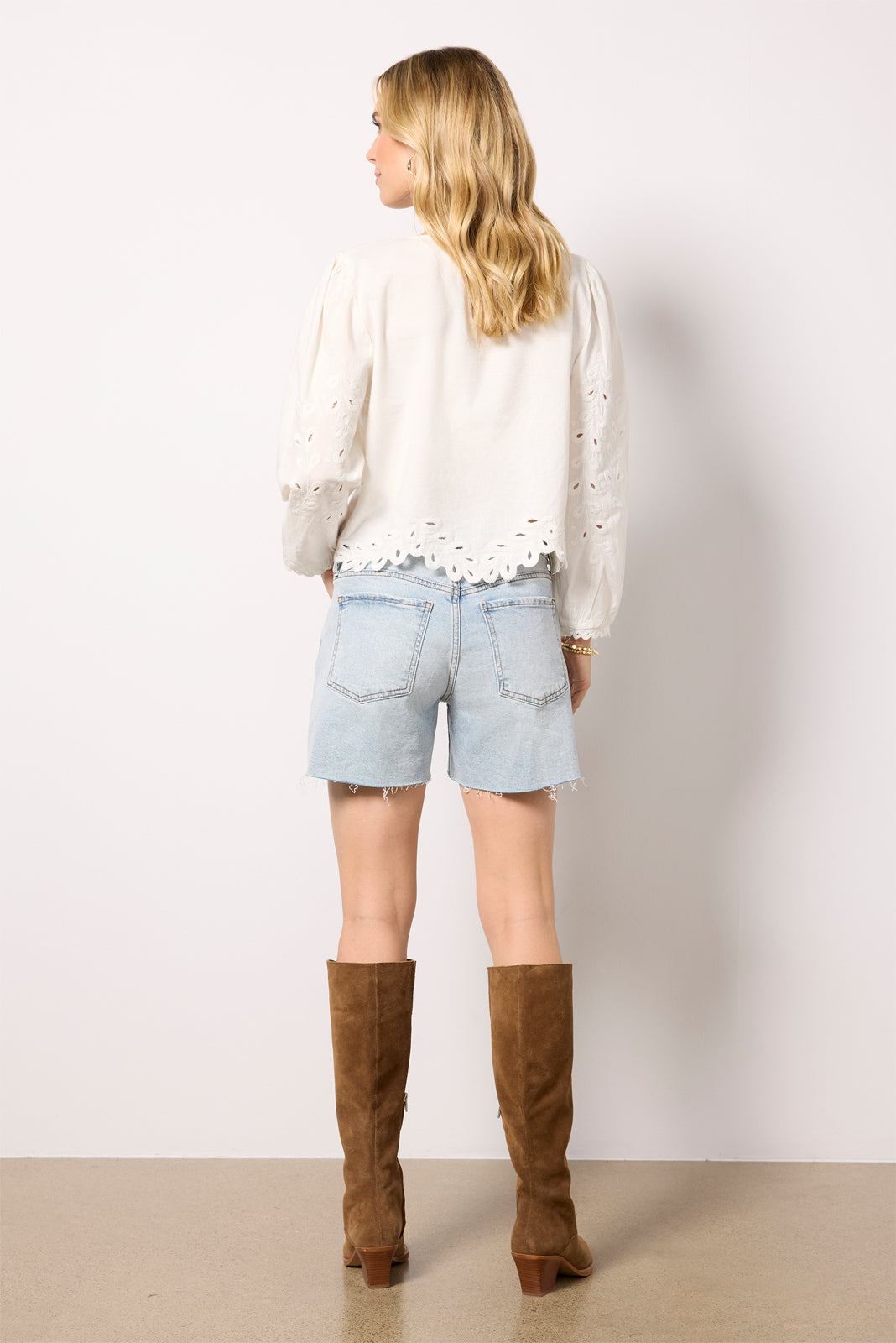Say hello to warmer weather in the Jane Short byKUT From The Kloth. Designed with a longer 4 1/2″ inseam, these versatile jean shorts are crafted in comfortable stretch denim withraw hems, a light blue wash, and an easy, relaxed fit.
