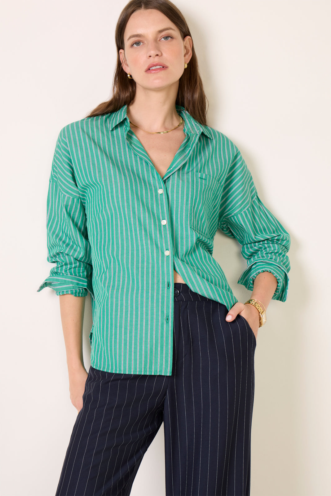 Say hello to your new favorite work top. The Jostriped button-down shirt by Alex Mill features a relaxed silhouette, left chest pocket, and cotton poplin fabric for a perfectly polished look.