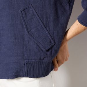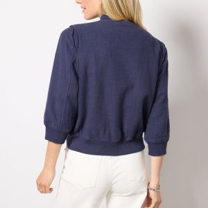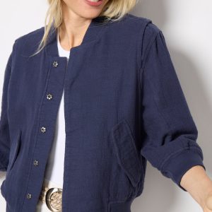 Refresh your layering collection with the Jordan Bomber Jacket by Bobi. Finished in textured cotton fabric, this chic jacket featuresa snap-front silhouette with side pockets, three-quarter sleeves, and rib knit trim.