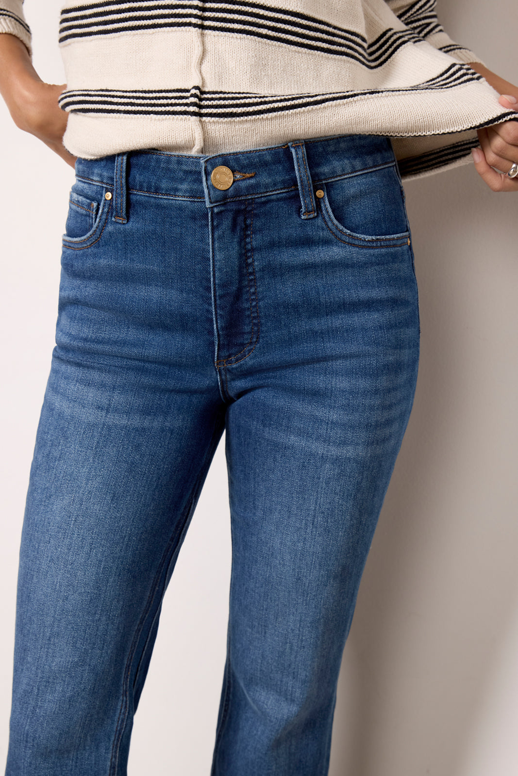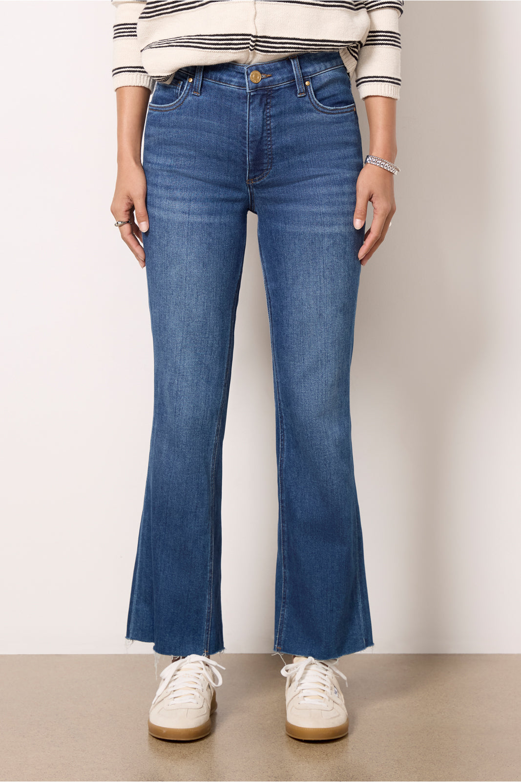 Agently flared leg creates the easy-to-love silhouette of these bootcut jeans byKUT From The Kloth.The Kelsey jean is crafted in soft stretch denim and features a versatile blue wash and ankle-length raw hems.