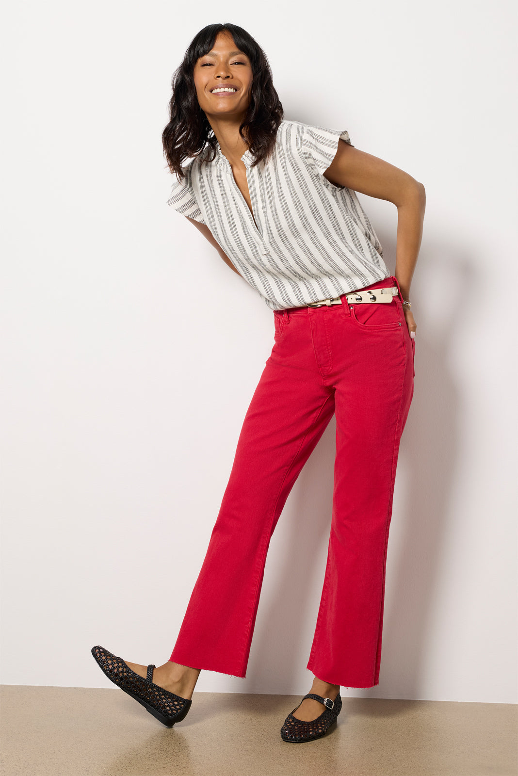 Add a pop of red to your denim collection with the Kelsey Jean by Kut from the Kloth, featuring a mid-rise waist, a flared silhouette, and cropped hems.