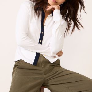 Theitem you will grab on repeat this fall is this chic top by Rag & Bone, featuring a polo collar, contrasting details, gold button closures, and a fitted silhouette.
