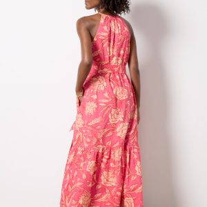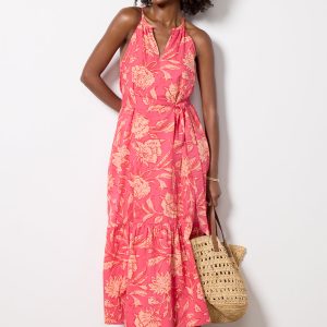 Pink botanical flowers define this easy maxi dress by EVEREVE, featuring a keyhole neckline, a tie waist, and a flattering tiered skirt.