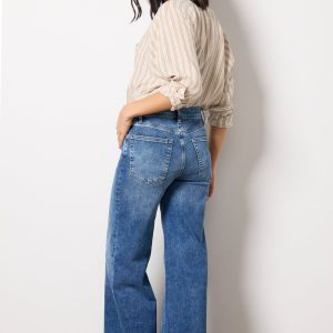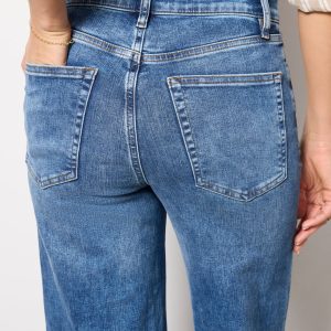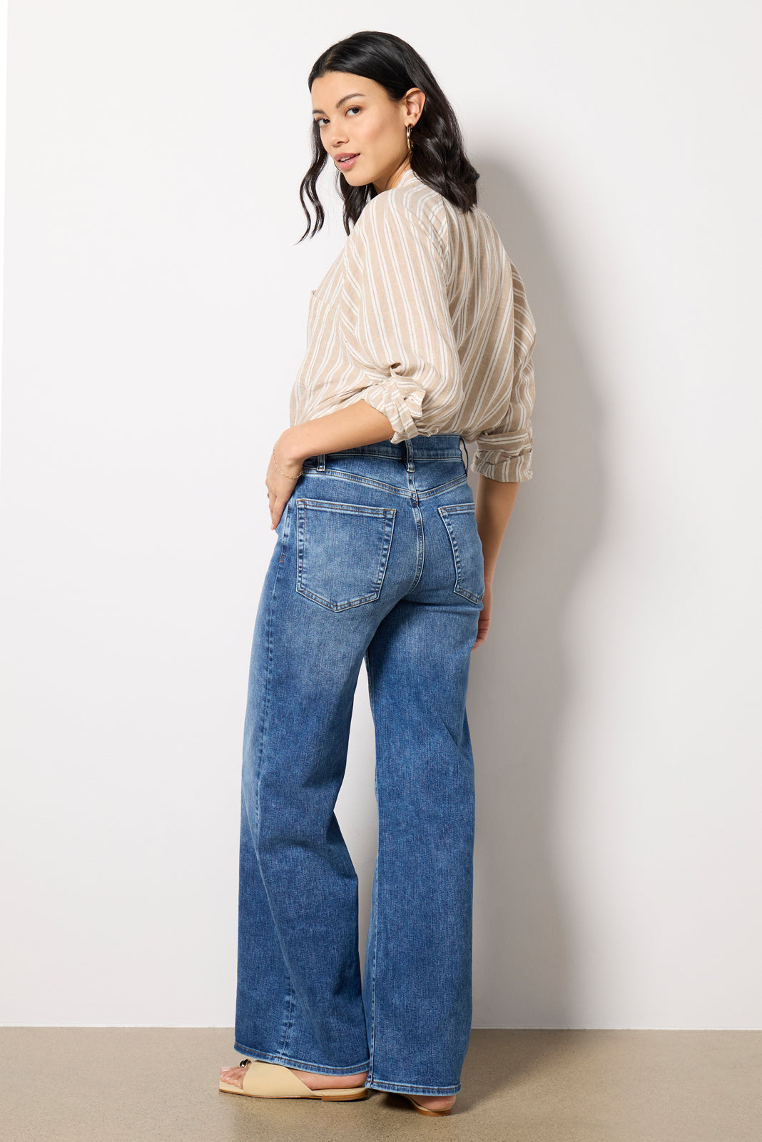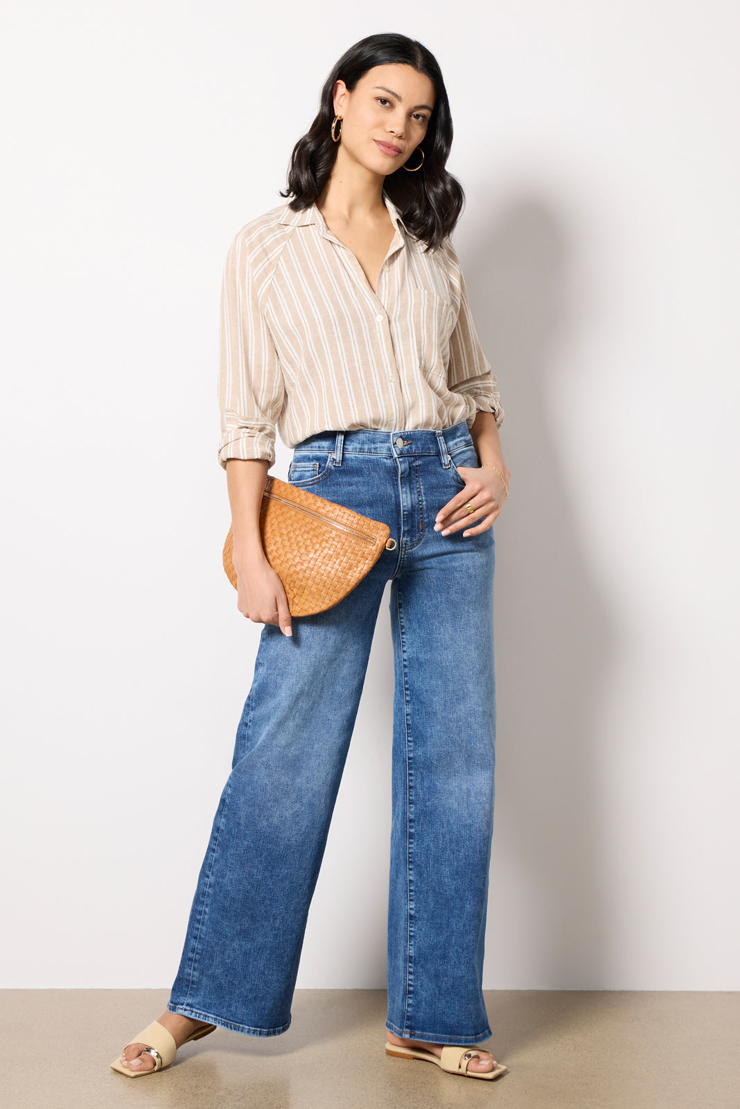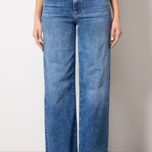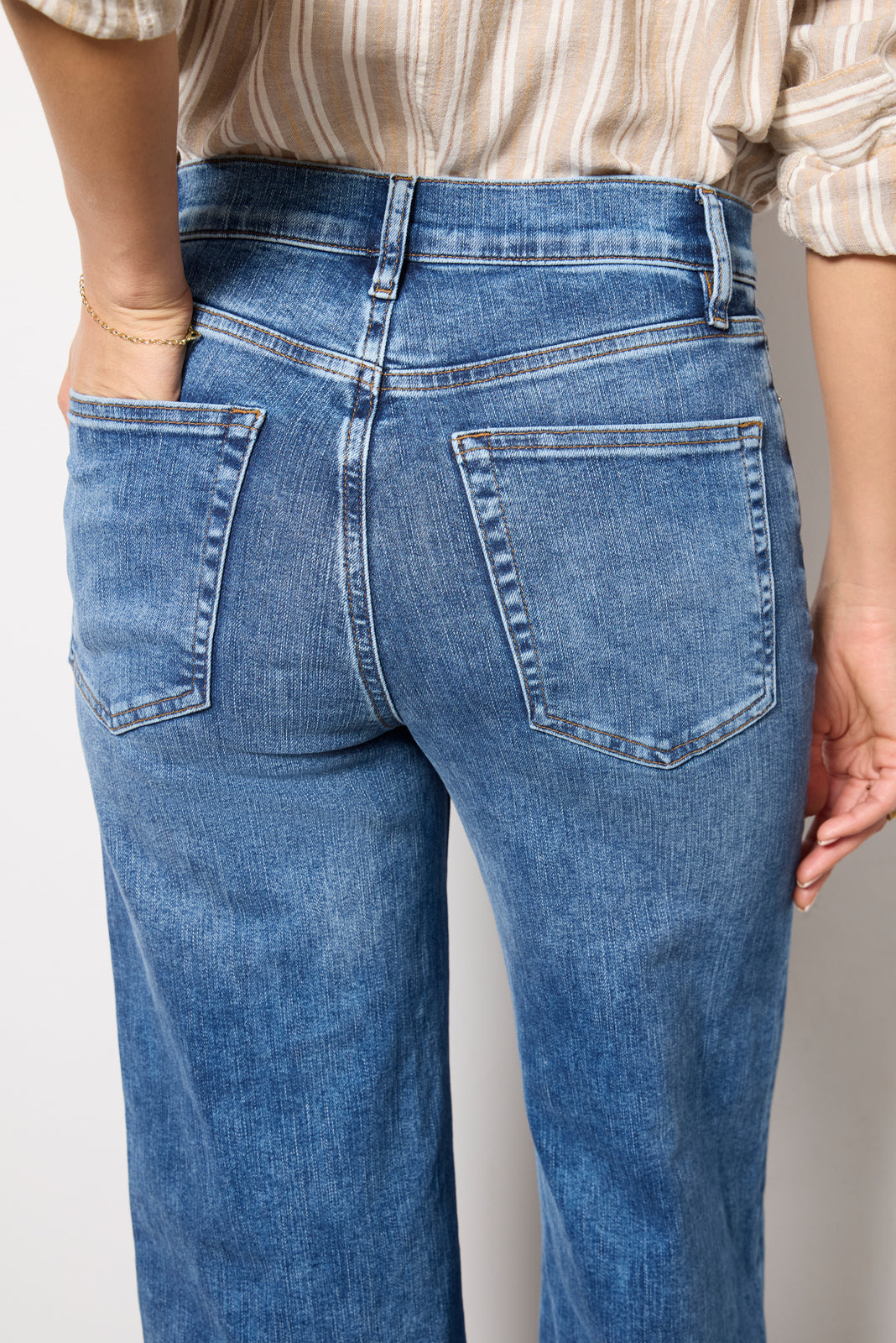 A wide leg jean that fits and flatters, the Le Slim Palazzo by FRAME is crafted in soft stretch denim with a high-rise waist, full-length inseam, and medium blue wash for day-to-night wear.