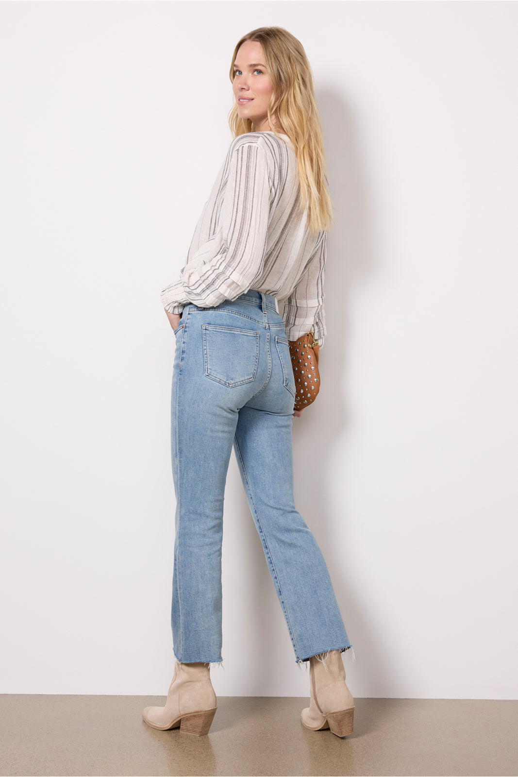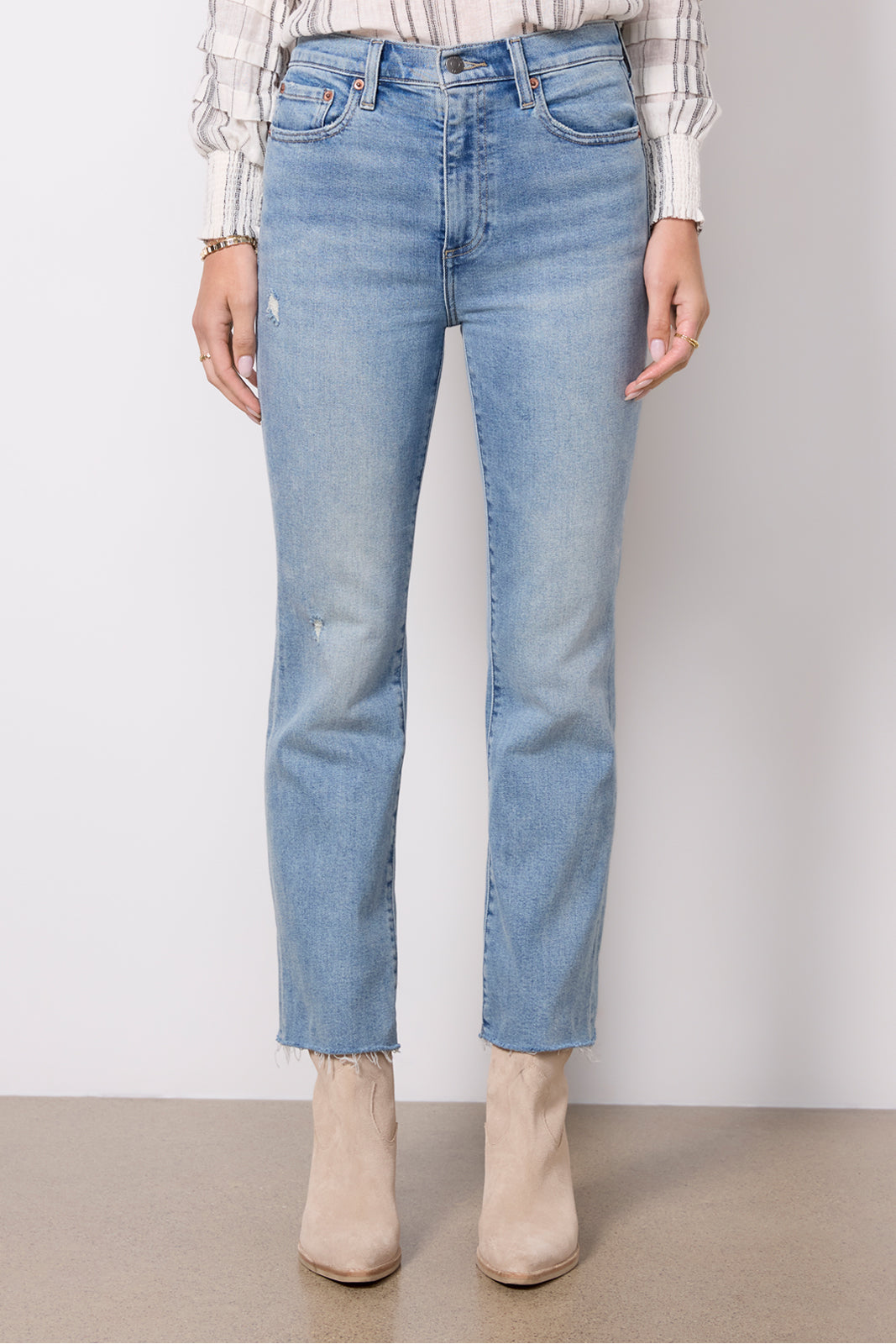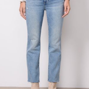 Finished in a versatileblue wash, these bootcut jeans by Pistola are crafted in soft comfort-stretch denim with a high-rise fit, distressed details, and raw hems cropped at the ankle.