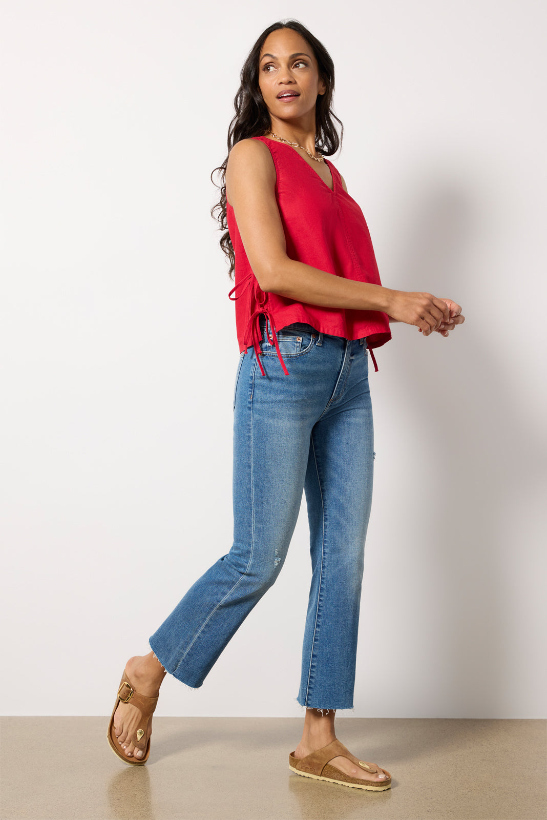 Finished in comfort-stretch denim, the Lennon bootcut jean by Pistola features a high-rise silhouette with raw ankle-length hems and subtle distressed details.