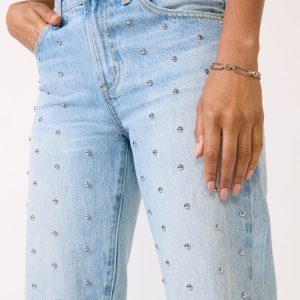 Silver studs add a stylish edge to the Lexi jean by Pistola. Designed with a relaxed, bowed leg, these light-wash jeans feature a mid-rise fit, full-length inseam, and rigid cotton denim fabric.