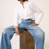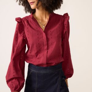 Feminine details define this textured blouse by EVEREVE, featuring acotton eyelet fabric, mock neckline, front button closures, ruffle details on the shoulder and collar, and a relaxed silhouette.