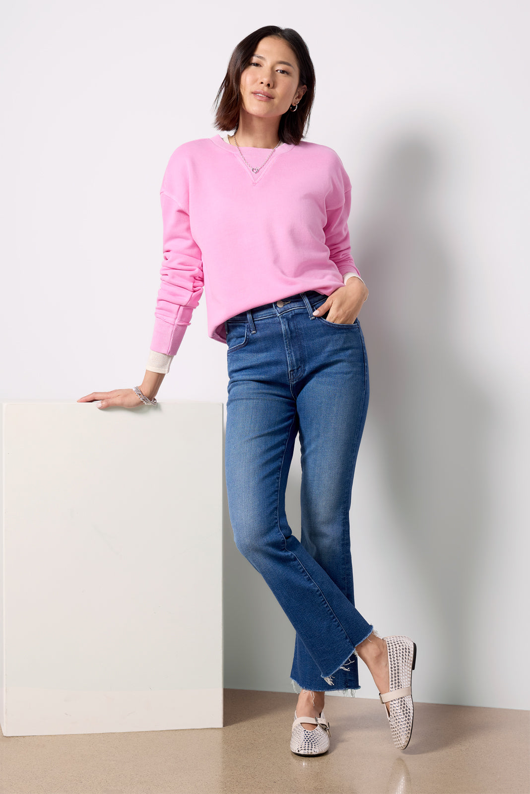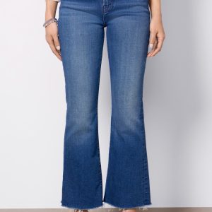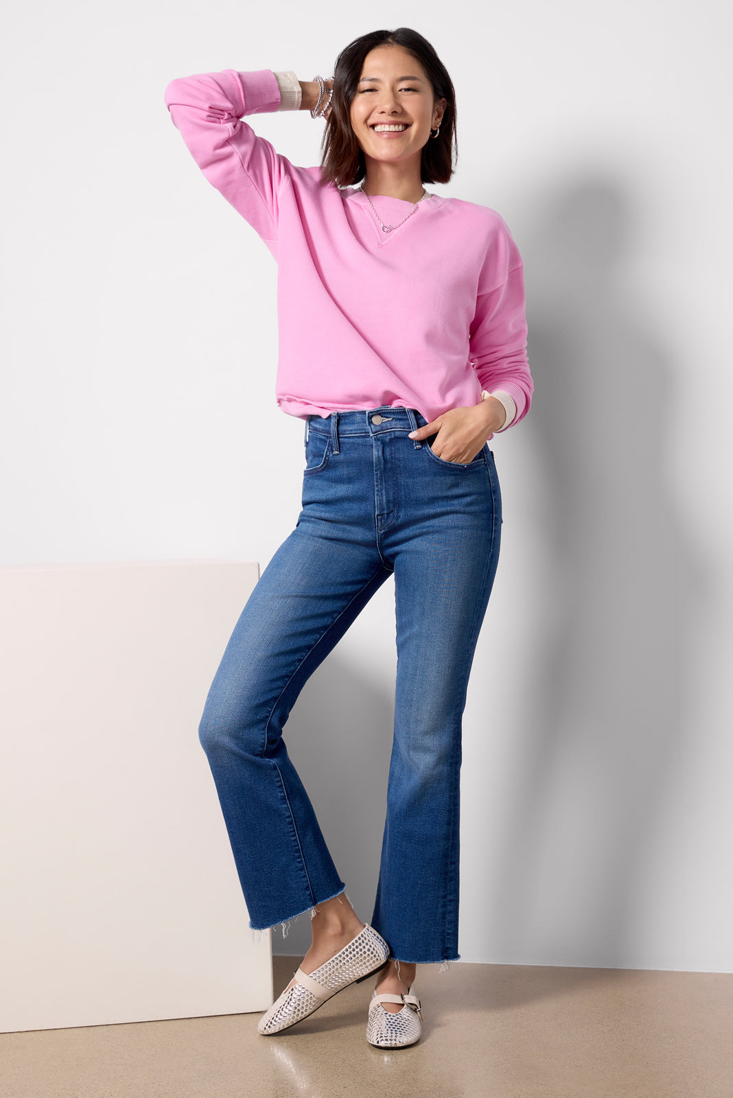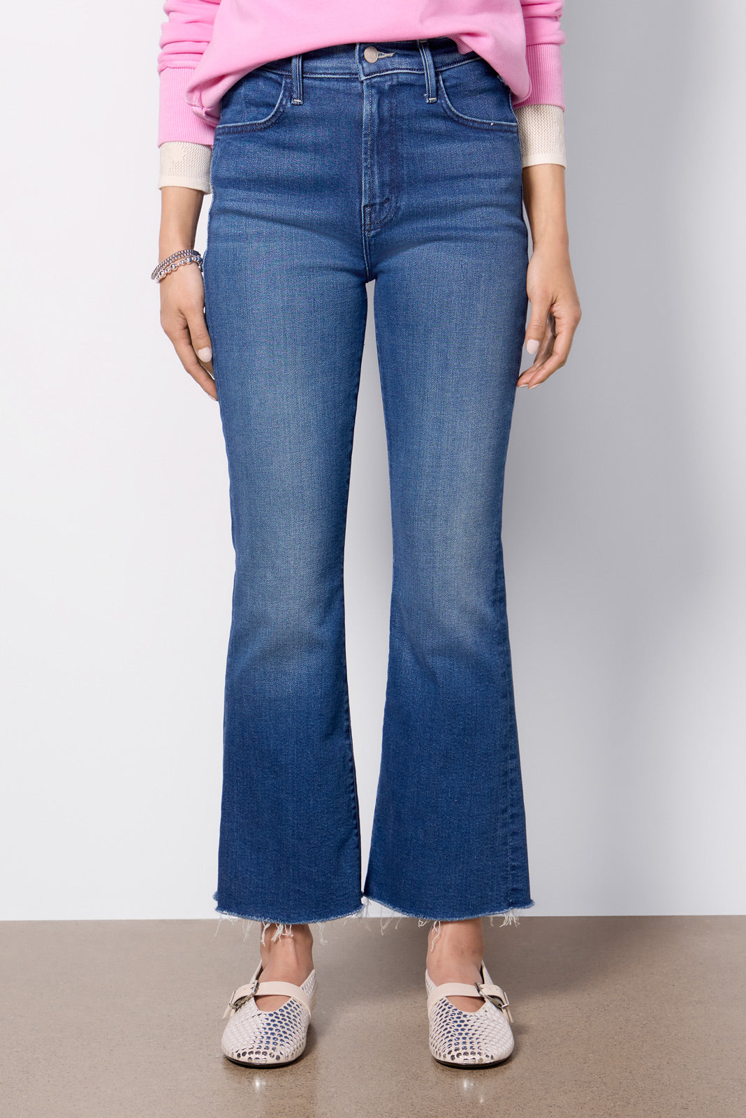 The Lil HustlerFlood Fray jean by MOTHER is a petite flare silhouette, featuring an ankle-length inseam, raw hems, and soft stretch denim in a medium blue wash. Designed to complement petite body types, these jeans feature a higher knee placement, shorter inseam, and shorter rise for a perfect, always-flattering fit.