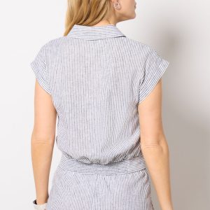 The Lilah Stripe Button Down by EVEREVE is crafted in a breezy linen blend and features a slightly cropped silhouette with a cuffed hem, bra-friendly gussets at the armholes, and button-front closures. Make it a matching set with the Lilah Stripe Short.