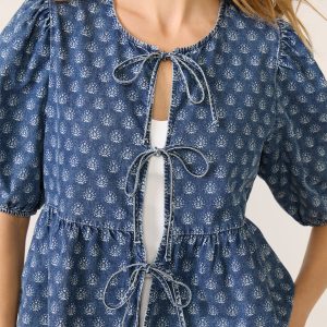 Finished in soft, printed chambray fabric, the Lucille top by EVEREVE features three tie-front closures, elbow-length puff sleeves, and a swingy peplum hem.