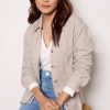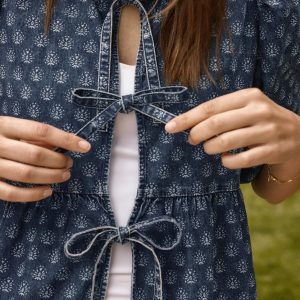 Finished in soft, printed chambray fabric, the Lucille top by EVEREVE features three tie-front closures, elbow-length puff sleeves, and a swingy peplum hem.