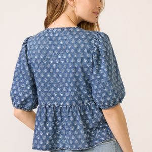 Finished in soft, printed chambray fabric, the Lucille top by EVEREVE features three tie-front closures, elbow-length puff sleeves, and a swingy peplum hem.