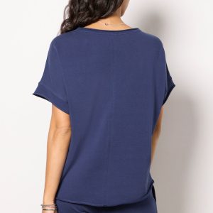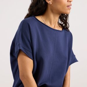 Crafted in a soft french terry fabric, the Luxe Lounge Short Sleeve Top by EVEREVE features a rolled boat neckline, dropped shoulders, a front center seam, and a relaxed fit. Make it a set with theLuxe Lounge Pant.