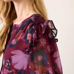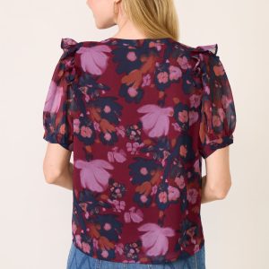 Ruffled flutter shoulderselevate this stylish button-front blouse by EVEREVE, featuring a relaxed fit, unlined short sleeves, and a gorgeous watercolor floral pattern.