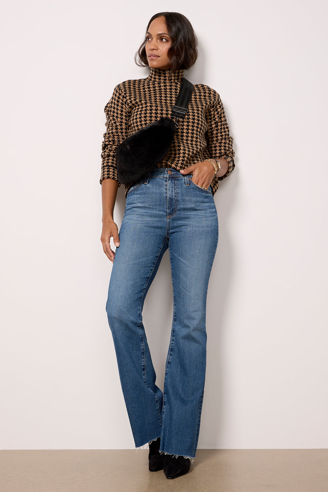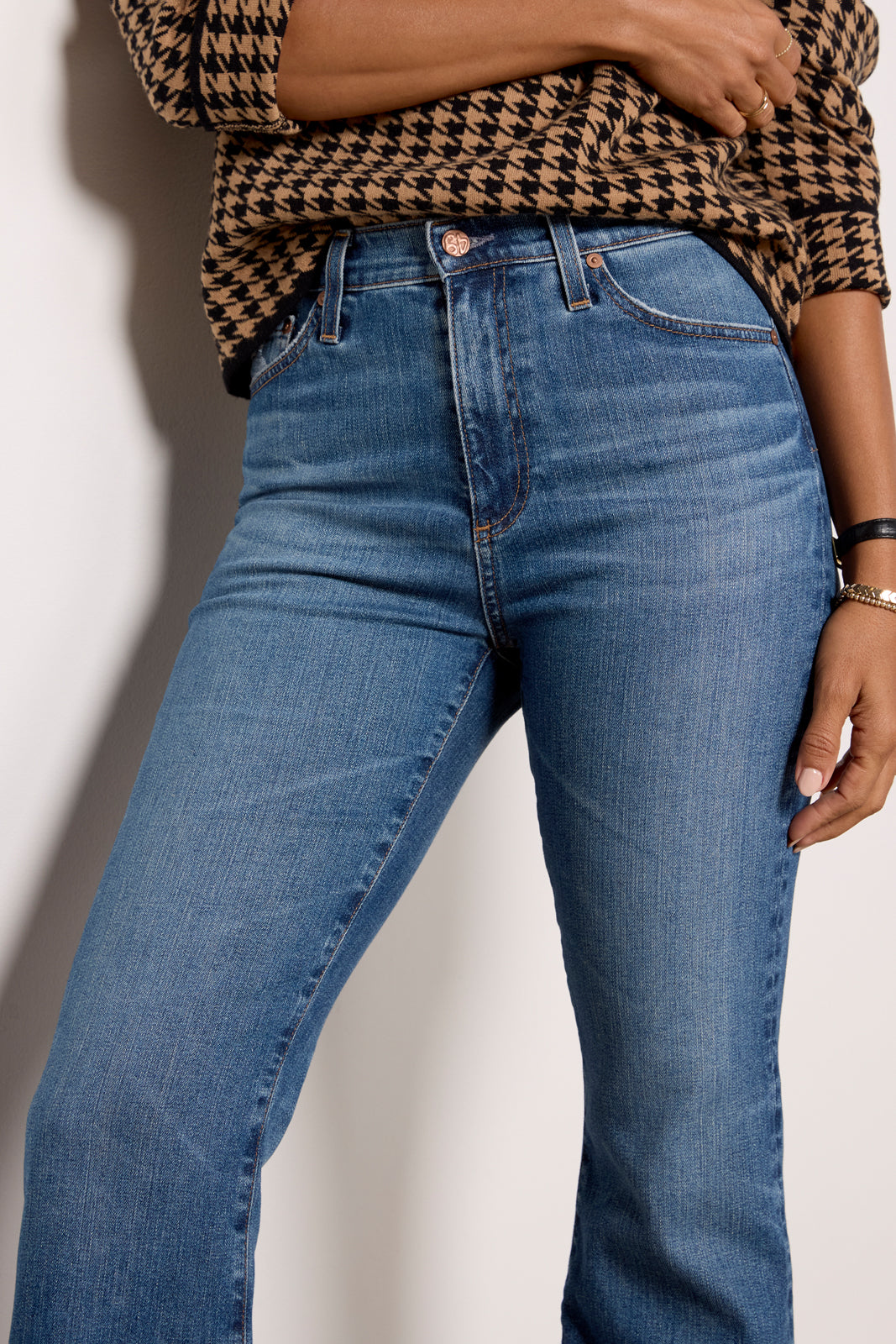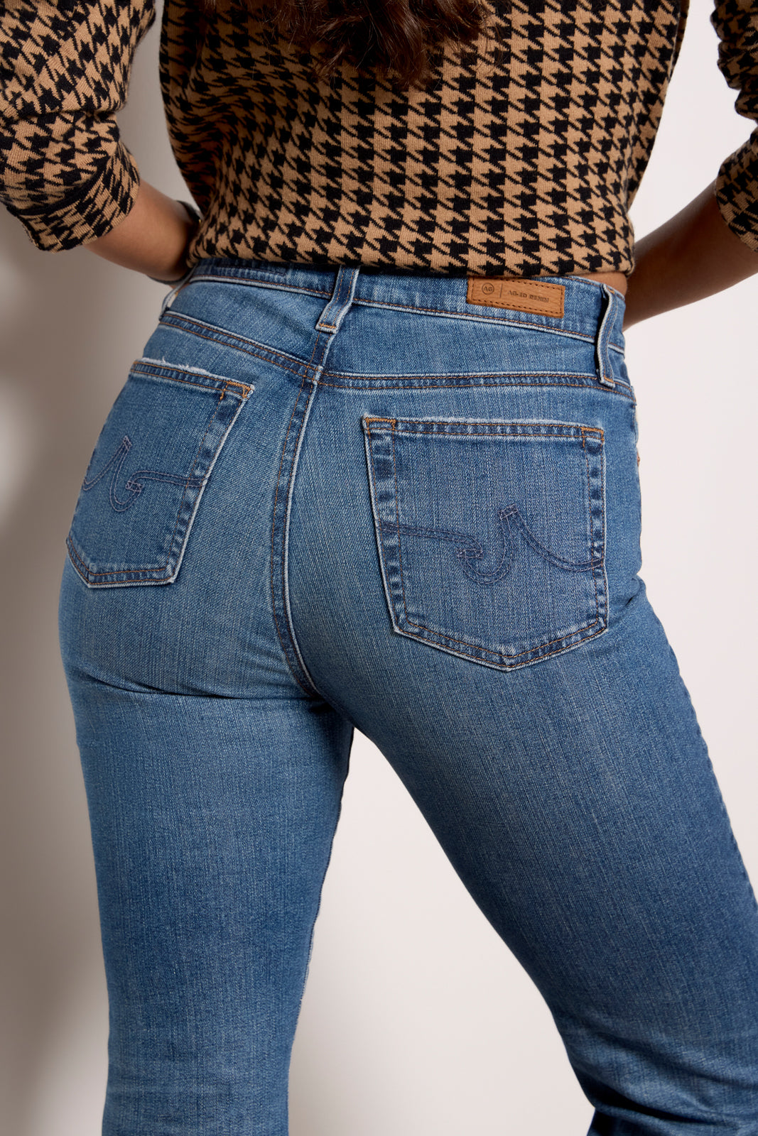 Dressed up or down, these high-rise flares by AG are the perfect addition to your denim collection,designed witha full-length inseam, faded blue wash, and raw hems.