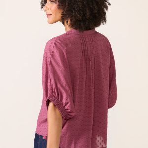 Crafted in organic cotton fabric, this button-front blouse by Emerson Fry features a mandarin collar, elbow-length puff sleeves, and pleated yoke detailing. This spring-ready top is finished in a flowy fit for an easy, effortless feel—perfect for dressing up or down.