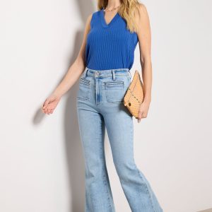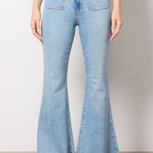 Welt pockets define the flattering Marlow Skimmer Jean from Paige, featuring stretch cotton denim, high-rise waist, and a flare leg silhouette with a full-length inseam.